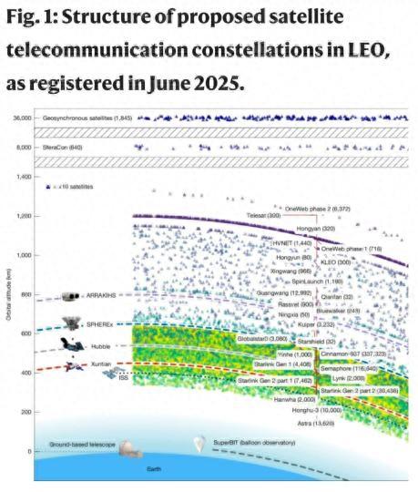 国际知名学术期刊《自然》最新发表一篇天文学论文分析警告称,今后十年里,部分低地轨道宇宙观测(空间天文望远镜)的约96%的影像或因卫星光污染而受污染。因此,天文学研究的成功开展需要将绕地卫星的光污染降至最低。