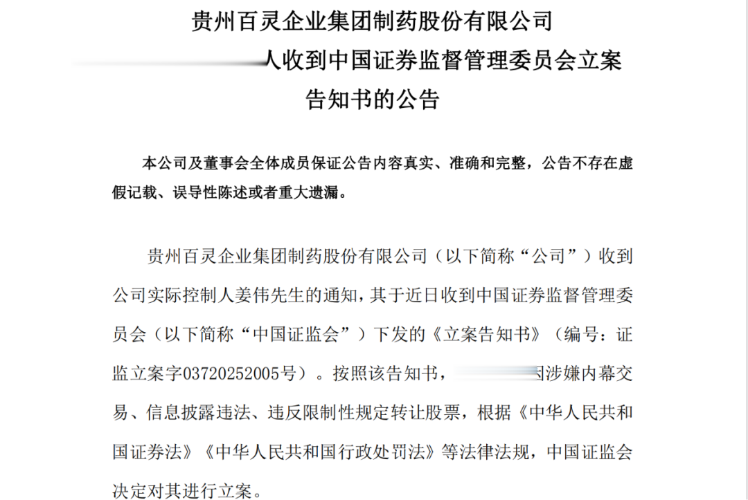 2024年11月8日,贵州百灵方面披露,收到中国证监会下发的《立案通知书》。因公司涉嫌信息披露违法违规,根据《中华人民共和国证券法》《中华人民共和国行政处罚法》等法律法规,中国证监会决定对贵州百灵立案。