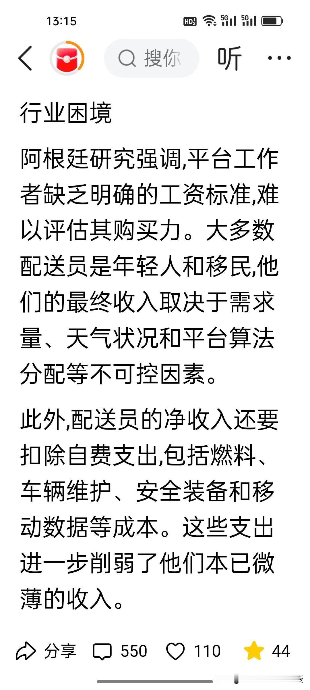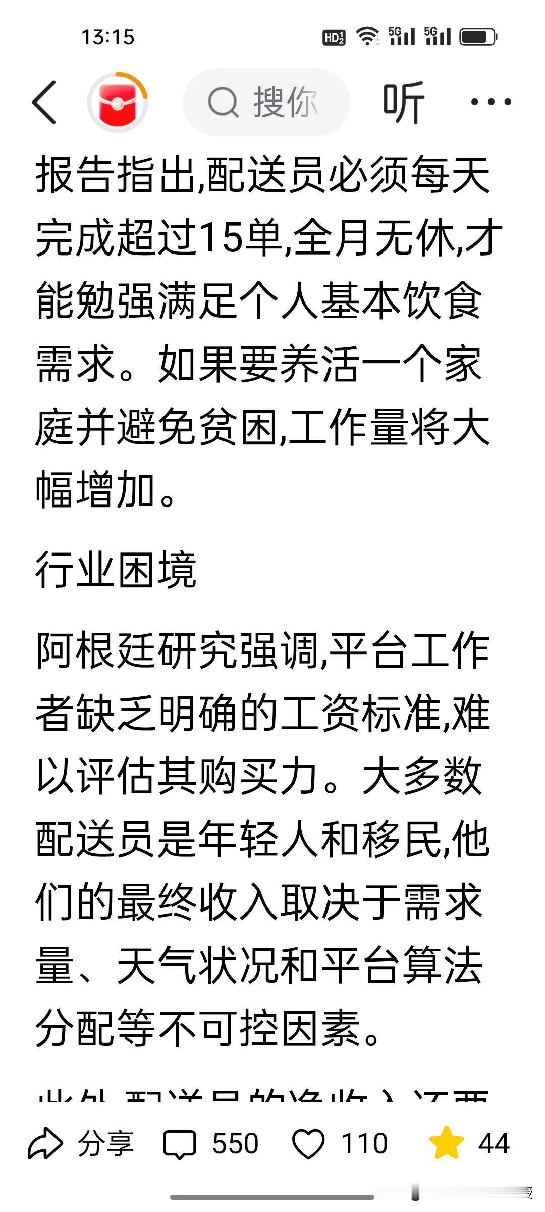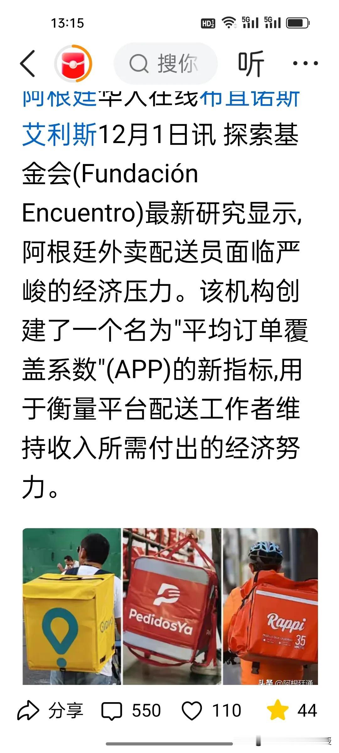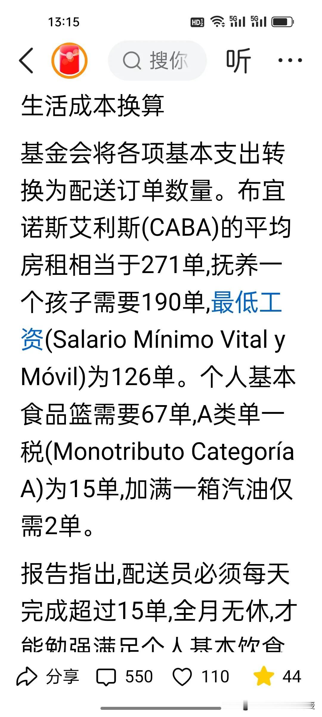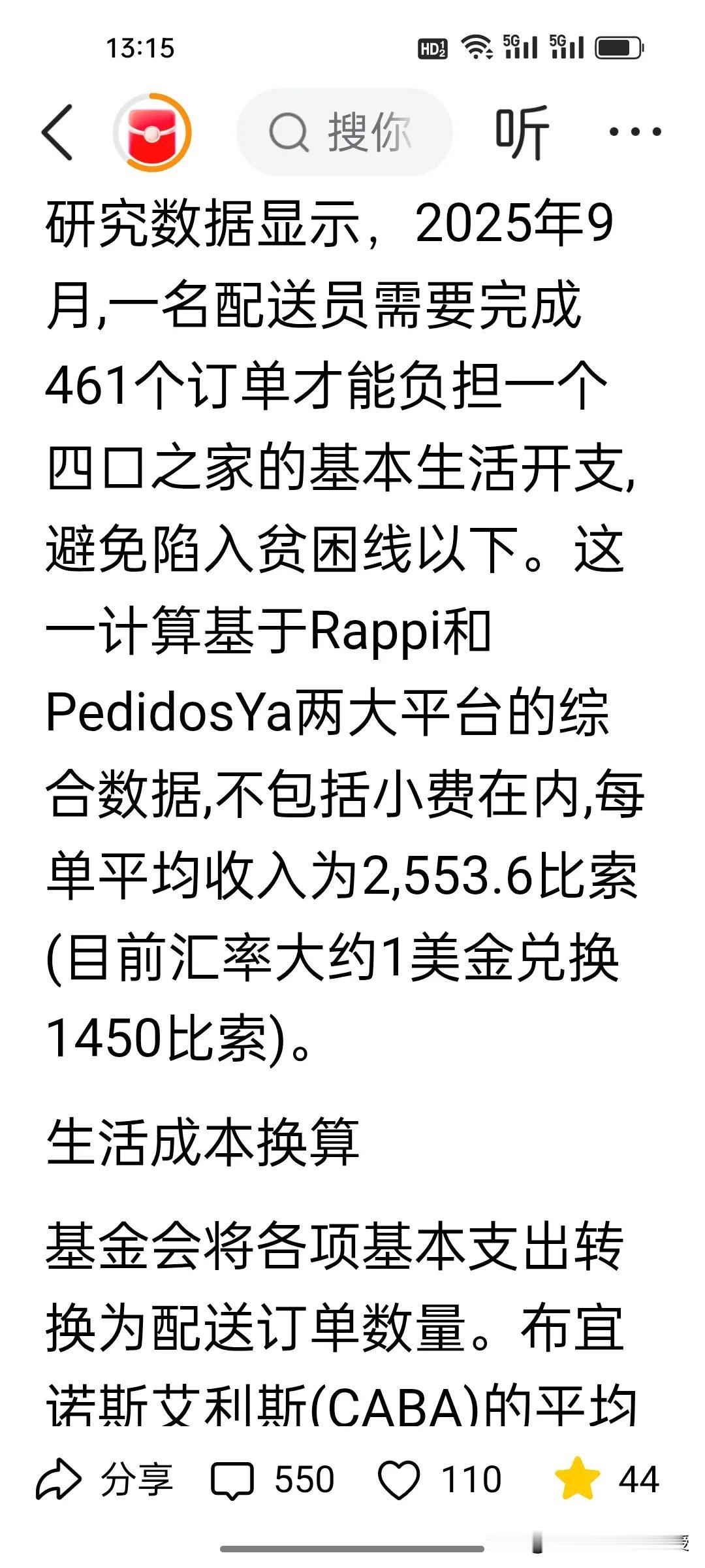 刚刚看到,阿根廷外卖员一天要送15单才可以养活一家四口,扣成本后净收入折合人民币约140-160元,外卖群体的经济压力很大。 在中国,骑手送15单可以有60-100元收入(不含成本),净赚50-80元,这个收入要满足一家四口的吃饭问题都不够的。中国全职骑手日均送单量整体在30-40单,就按照30单算,净赚100-160元,这个收入才能够一家四口吃饭。