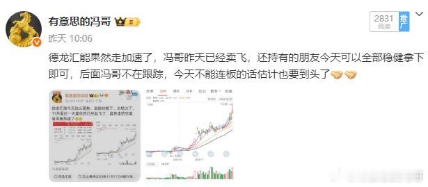 看图说话,这就是冯哥一直强调的不要贪心最好的体现了,昨天冯哥也是苦口婆心跟大家说这两个必须牢牢把握住了,今天中水渔业跌停,德龙汇能也是大跌,稳健拿捏规避风险,给冯哥点赞