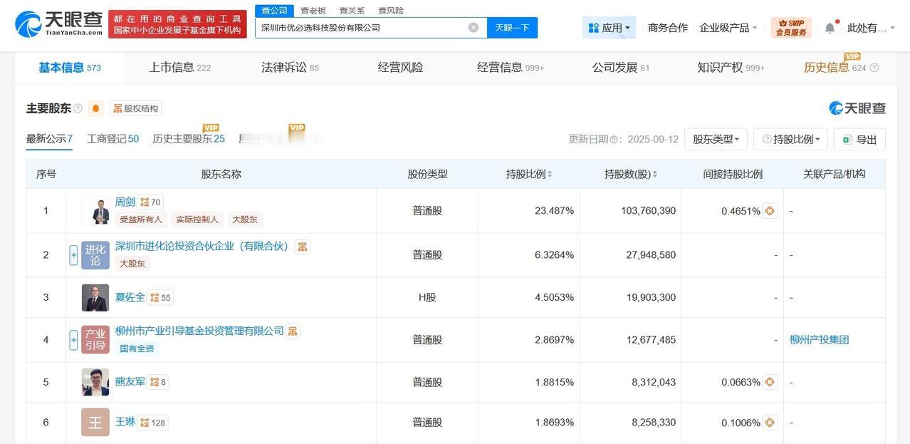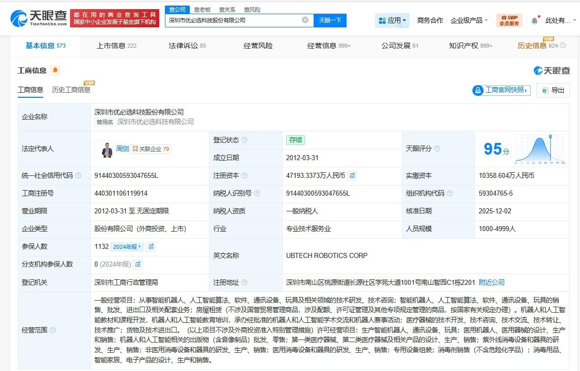 优必选增资至4.7亿增幅约7% 天眼查工商信息显示,近日,优必选(09880.HK)发生工商变更,注册资本由约4.4亿人民币增至约4.7亿人民币,增幅约7%。 深圳市优必选科技股份有限公司成立于2012年3月,法定代表人为周剑,经营范围含从事智能机器人、人工智能算法、软件、通讯设备、玩具及相关领域的技术研发、技术咨询,智能机器人、人工智能算法、软件、通讯设备、玩具的销售、批发、进出口及相关配套业务等。股东信息显示,该公司由周剑、深圳市进化论投资合伙企业(有限合伙)、夏佐全等共同持股。 天眼查信息: