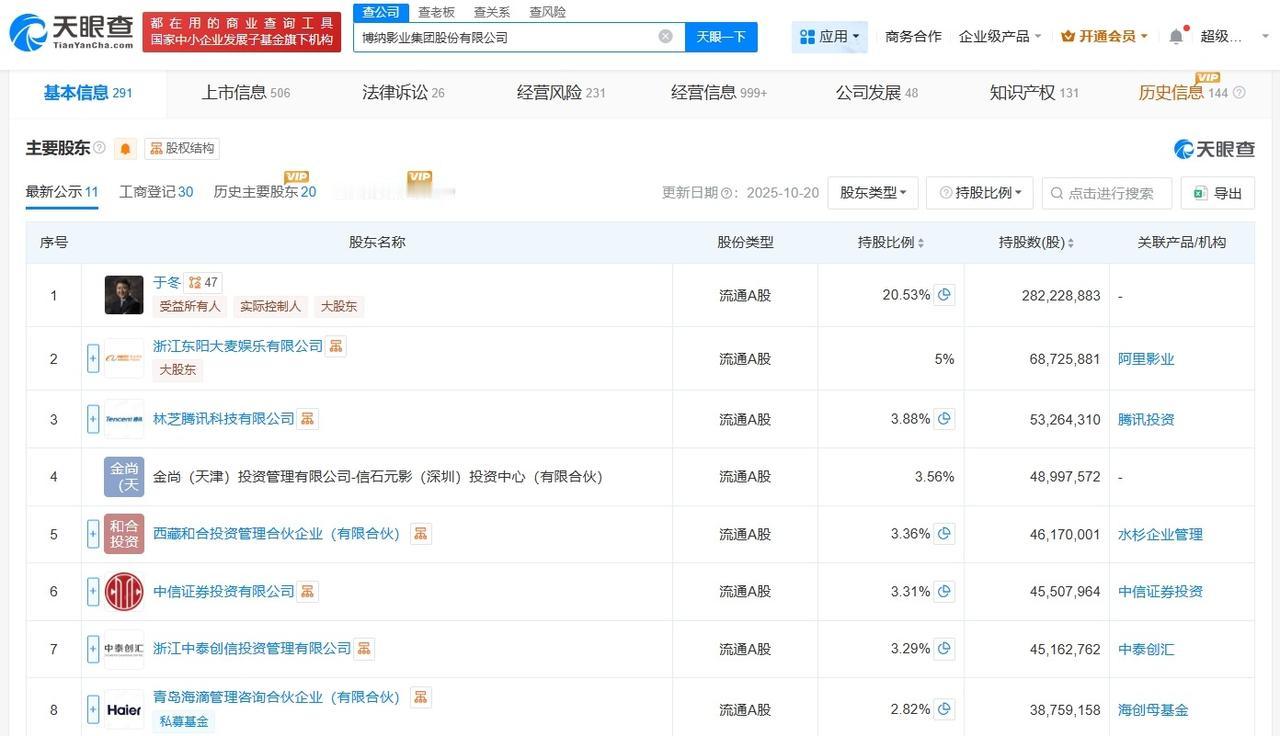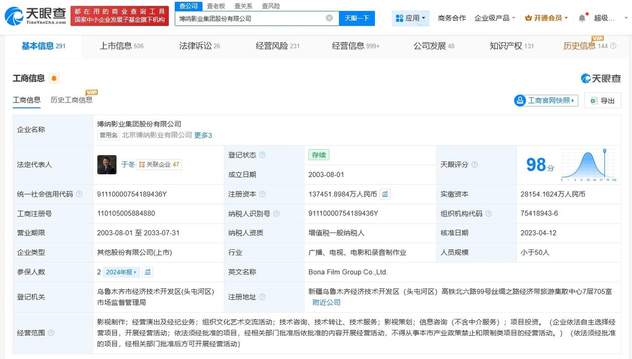 博纳影业被执行150万 博纳影业成被执行人 天眼查天眼风险信息显示,近日,博纳影业集团股份有限公司、北京博纳影业集团有限公司新增1条被执行人信息,执行标的150万元,执行法院为邹平市人民法院。 博纳影业集团股份有限公司成立于2003年8月,法定代表人为于冬,注册资本约13.75亿人民币,经营范围包括影视制作、经营演出及经纪业务、组织文化艺术交流活动等。股东信息显示,该公司由于冬、浙江东阳大麦娱乐有限公司、林芝腾讯科技有限公司等共同持股。