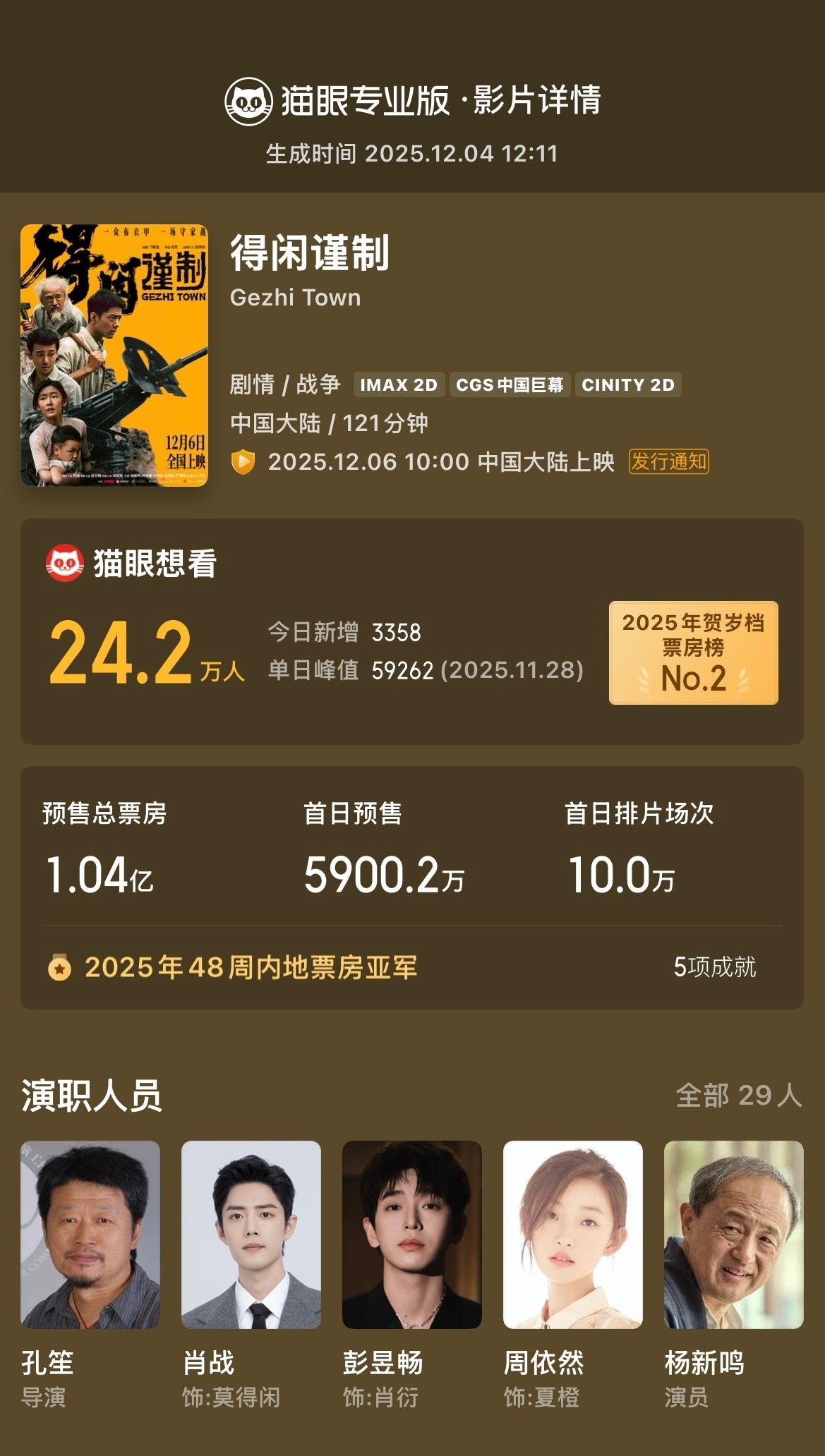 肖战的品牌方们开始发力了 被肖战新电影《得闲谨制》品牌方们的包场数量和品牌方数量之多震撼到了..几十场至上百场且仍在源源不断加场中!肖战的品牌号召力与影响力有目共睹。该电影将于12月6日上映,据猫眼专业版数据,目前预售票房已超1亿。大银幕见!电影得闲谨制