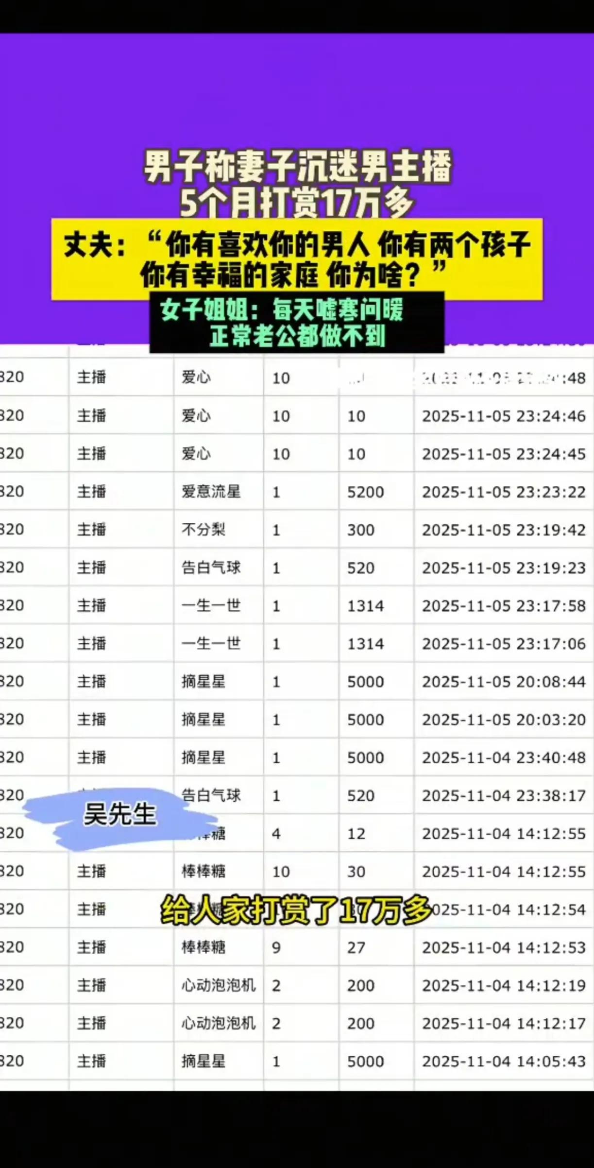 “色即是空”!郑州icon有位已婚女子,在短短五个月内打赏男主播17万元。丈夫发现后,痛苦又无奈地质问妻子:“你有喜欢自己的男人,有幸福的家庭,还有两个孩子,为何要这么做?”妻子坦言:“我喜欢他,他对我很好,每天都嘘寒问暖,这是你做不到的。” 17万不是小数目,大概率是家里的积蓄甚至可能有借款。丈夫每天起早贪黑挣钱养家,以为日子能稳步向前,没成想辛苦攒下的钱,全变成了主播直播间的虚拟礼物。 妻子口中的“嘘寒问暖”,不过是主播的职业话术。对着屏幕那头成千上万的观众,说几句关心的话、道几声晚安,就能轻松赚得盆满钵满,这样的“好”太廉价。 可她偏偏当了真,把虚拟世界的温柔当成了救赎。忽略了身边丈夫默默的付出,忘了两个孩子需要抚养,更忘了婚姻的责任与担当。 身边人得知这件事,都替丈夫不值。好好的家庭因为一场不切实际的迷恋濒临破碎,实在让人唏嘘。 网络直播的繁华背后,多少人被表面的热情迷惑。那些隔着屏幕的甜言蜜语,从来都不是真心,只是为了掏空你的钱包。 不知道这位妻子醒悟后,该如何面对丈夫和孩子,又该如何填补这17万的窟窿。生活从没有捷径,虚拟的温柔也换不来真实的幸福。 各位读者你们怎么看?欢迎在评论区讨论。 来源:小莉帮忙 2025-12-1采访