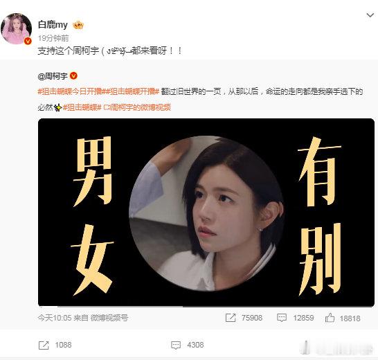 白鹿为周柯宇新剧宣传白鹿这宣传委员太称职了!专门为周柯宇新剧《狙击蝴蝶》打 call,走心又义气,这波神仙友情必须支持,新剧安排上~ 白鹿为周柯宇新剧打call