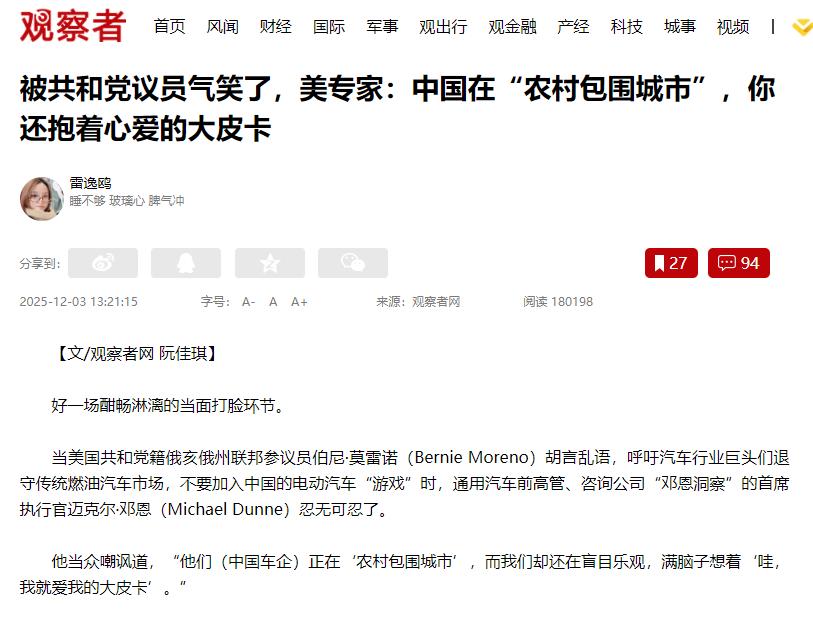 千万不要小看中国!美专家直言:中国在“农村包围城市”的时候,美国人还抱着心爱的大皮卡傻笑呢。 美国有个共和党议员叫伯尼·莫雷诺,居然公开劝美国汽车巨头别搞电动汽车,退回燃油车市场,还说中国电动车是在“玩游戏”。 这话直接把通用汽车前高管迈克尔·邓恩惹毛了,当场就怼回去:“中国车企正在‘农村包围城市’抢市场,咱们倒好,还傻乐着抱着大皮卡不放。” 据媒体12月2日报道,这事就发生在华盛顿一个汽车行业论坛上,连《底特律新闻报》都报道了,这个议员的话实在太离谱了。 说真的,听完这话谁不觉得可笑?都2025年了,全世界汽车都在往电动化转,他反倒劝车企往回走,这不是明着让美国汽车产业自寻死路吗? 邓恩说的“农村包围城市”可不是瞎编的,是中国车企实打实的路子,有数据有事实摆在那。 这里的“农村”不是真农村,是欧美车企看不上的新兴市场,比如东南亚、南美这些地方。 中国车企先在这些地方站稳脚,攒够销量和口碑,再转头攻欧美这些汽车核心市场。 就说比亚迪,2025年前十个月海外就卖了78万辆车,比去年同期多了一倍还多。 上汽的MG品牌在欧洲也卖得火,前十个月交了25万辆。现在中国电动车在欧洲占了5.1%的市场,连美国旁边的墨西哥,都被我们占了4.4%的份额,这就是这个路子的威力。 再看莫雷诺当宝贝的大皮卡,看着卖得好,其实问题一大堆。美国老百姓爱买汽油版大皮卡,比如福特F系列10月卖了6.6万辆,但电动版只卖了1500辆,创了新低。 福特搞电动车从2023年到现在亏了130亿美元,都想放弃电动皮卡了;通用、斯泰兰蒂斯要么缩减电动皮卡生产线,要么直接取消项目。 美国电动皮卡不行,说白了就是技术差、成本高。比如福特电动皮卡,电池贵还重,载重和续航都不行。 更可笑的是,美国车企把80%的研发钱都投给了燃油车,通用2024年在传统动力上的研发占比高达72%,不搞电动化创新,就抱着老皮卡不放,这就是邓恩说的“盲目乐观”。 有人说美国有特斯拉撑着,但美国新能源车市场一半以上的份额都靠特斯拉,本土车企根本没存在感。反观中国,全球每10辆电动车里7辆是中国造的,出口占了全球40%。 从挖矿到做电池,我们全产业链都能自己搞定,美国90%的电池材料都要进口,本土化目标才完成18%。 现在全球都在往电动化转,欧盟2035年就禁售燃油车了,挪威现在新能源车占比都超90%了。 这时候莫雷诺还劝车企退回去搞燃油车,纯属逆着潮流走。中国车企的路子是抓住了未来机遇,不是在玩游戏。 说到底,汽车行业竞争拼的是技术和趋势,靠情怀和固执赢不了。中国车企赢在顺趋势、技术硬、产业链全。 莫雷诺们再抱着大皮卡不放,无视电动化浪潮,最后只会让美国汽车产业被全球甩在身后。这顿打脸,真希望能打醒这些执迷不悟的美国政客,别再用蠢话耽误行业发展了。