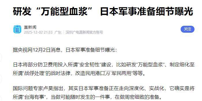 日本军事准备细节曝光! 日本将部分防卫费用投入所谓“安全韧性”建设,比如研发“万能型血浆”、制定细化至所谓“战俘处理”的战时法律,改造民用港口为“军民两用”等等。 咱们常说“听其言观其行”,这话用在日本身上再合适不过。嘴上喊着“和平发展”,手里的动作却半点没停。 那些包装得花里胡哨的“民生项目”“安全建设”,拆开来看全是呛人的硝烟味。 “万能型血浆”,表面上是厚生劳动省牵头的民生项目,背地里防卫省悄悄砸进去8亿日元研发费。 这东西最大的特点是不用匹配血型,战场上拿过来就能给伤员用,压根不是给普通病人准备的便民福利。 为了攒够这些“战场血”,自卫队下了血本,现在士兵献血直接给5000日元补贴,比以前翻了一倍。 比血浆更反常的,是和平年代专门细化“战俘处理”的战时法律。哪个真心盼和平的国家,会没事干研究怎么管理战俘? 二战时澳大利亚因为达尔文港被炸、战俘遭斩首,战后根本不接受日军投降,17万战俘没剩几个;苏联把60万日军战俘送去西伯利亚,活下来的还不到40万。 可咱们中国当年以德报怨,给战俘治病发物资,遣返时个个衣着整齐,换来的却是这样的备战姿态。 现在日本正忙着把33个民用机场和港口改成“军民两用”,鹿儿岛港、名濑港这些平时装集装箱的地方,半夜里偷偷练弹药运输,码头边悄悄加建军事设施。 那霸港干脆扩建到能停两艘万吨级登陆舰,冲绳北边的马毛岛更夸张,一条2000米的跑道连夜赶工,就是给美军航母舰载机练起降用的,为了2030年完工,连周末都不停工。 旁边的石垣岛新修的弹药库,号称能支撑14天高强度作战,国际专家都看透了:日本这是把“台海有事”当成随时会爆的雷在准备。 这些动作能落地,全靠防卫费疯涨在撑腰。原本说2027年把防卫费提到GDP的2%,结果2025年就提前兑现了,全年防卫相关费用飙到11万亿日元,合人民币快5000亿了。 钱都花哪儿了?光买美国军火就花了一大笔。2024年刚签了400枚“战斧”巡航导弹的合同,今年又添了JASSM-ER隐形导弹。 加上之前订的147架F-35,日本眼看就要搞出全球第二大隐形战机群,打击范围一下翻了好几倍。 更别提他们把“出云”级驱逐舰改成轻型航母,还在搞射程900公里的国产反舰导弹,进攻性武器装备越来越全。 美国想把它当棋子围堵别人,可日本的小算盘打得更精,借着别人的势力恢复军事野心,早晚要捅出大麻烦。 和平从来不是靠妥协来的,更不是靠忘记历史换的。日本这些动作不是孤立的,咱们不能被“民生”“创新”的幌子骗了,更不能因为日子太平就放松警惕。 瞪大眼睛看清它的真面目,守住咱们来之不易的和平生活,这才是对历史最好的纪念,绝不能让过去的悲剧再重演。