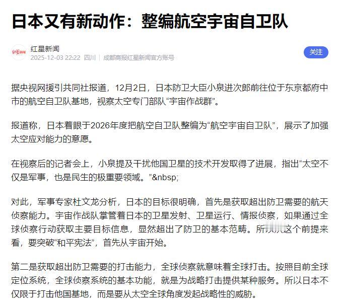 日本又有新动作了!据央视报道,12月2日,日本防卫大臣小泉进次郎视察了东京都府中市航空自卫队基地的“宇宙作战群”。而且,最重要的是,日本计划2026年将航空自卫队整编为“航空宇宙自卫队”,强化太空军事能力。此次调整绝非小事,而是日本冲破和平宪法约束、推进军事扩张的危险信号,其背后野心必须认清。 这支“宇宙作战群”是日本太空军事化的核心力量,2022年3月成立时仅70人,扩张速度惊人。 按计划,2025年升级为“宇宙作战团”,2026年随整体整编升为“宇宙作战集团”。四年内从几十人小队伍扩成集团级单位,显然不是为了防卫,而是在加紧打造太空作战力量。 光有人不够,还得砸钱搞技术,日本对此毫不吝啬。公开数据显示,过去五年日本太空军事相关投入达2833亿日元,未来10年计划投入1万亿日元,翻了数倍之多。 今年日本防卫省为太空项目申请的资金预算,比去年增长了115%,其中,计划投入1238亿日元用于研发制造下一代军用通信卫星。 日本紧盯太空,核心是想借这一新领域突破约束搞军事扩张。作为二战战败国,《波茨坦公告》禁止其重新武装,和平宪法规定仅能防卫。 这些年它一直想突破限制,明搞进攻性武器会遭国际反对,便打太空的主意。 军事专家早已点破,日本搞“航空宇宙自卫队”,就是要获取超出防卫需求的太空侦察能力,摸清他国重要目标,这根本不是家门口防卫该做的事,十足的没安好心。 更危险的是,侦察能力背后就是打击能力。当前军事技术中,太空侦察和定位都是为精准打击服务的,日本掌握太空侦察,就意味着能从太空对全球目标构成威胁。 这并非孤立动作,11月底小泉进次郎还视察琉球群岛自卫队基地,宣称要如期部署中程导弹。 该基地所在的与那国岛距我国台湾仅110公里,如此近部署攻击性武器,针对谁不言而喻。太空布局加家门口部署导弹,日本在亚太搞威慑的心思昭然若揭。 日本敢如此明目张胆,全靠美国撑腰。美国近年大力发展“天军”争夺太空霸权,日本借机抱大腿,参与美军“太空旗”“全球哨兵”等太空演习,还计划联合开发天基反导系统。 一旦日美太空作战能力联手,再加上远程打击能力,将严重威胁亚太乃至全球安全。日本就是借美国势力壮胆,一步步实现军事正常化野心。 此外,日本国内老龄化、少子化严重,经济增长乏力、财政紧张,民众怨气不小。 右翼势力想靠军事扩张、渲染外部威胁转移注意力,提升“民族自信心”。这无疑是饮鸩止渴,巨额军费会加重财政负担,最终苦了老百姓。 日本国内不少有识之士也反对,担心引发军备竞赛破坏和平,毕竟二战伤痛难忘。 日本太空军事技术其实短板不少,太空态势感知、卫星通信等核心技术依赖美国,航天产品少而贵、成本高,长期难维持。 即便如此,它仍执意军事扩张,这种不顾后果的做法,正将自身和地区拖向危险。 我国外交部早已表态,日本近年频繁调整安保政策、增加军费、放宽武器出口,右翼势力穷兵黩武愈走愈远。 二战后亚洲和平稳定来之不易,日本作为战败国本应恪守和平承诺,却在太空和亚太频频搞军事动作,严重破坏和平根基。 总而言之,日本整编“航空宇宙自卫队”绝非简单机构升级,而是突破和平约束、推进军事扩张的关键一步,背后是依附美国、威慑周边的险恶用心。 中国对这一危险动向必须高度警惕。国际社会也应联手督促日本认清形势,放弃军事扩张幻想,踏实走和平发展道路,否则终将为野心付出惨痛代价。