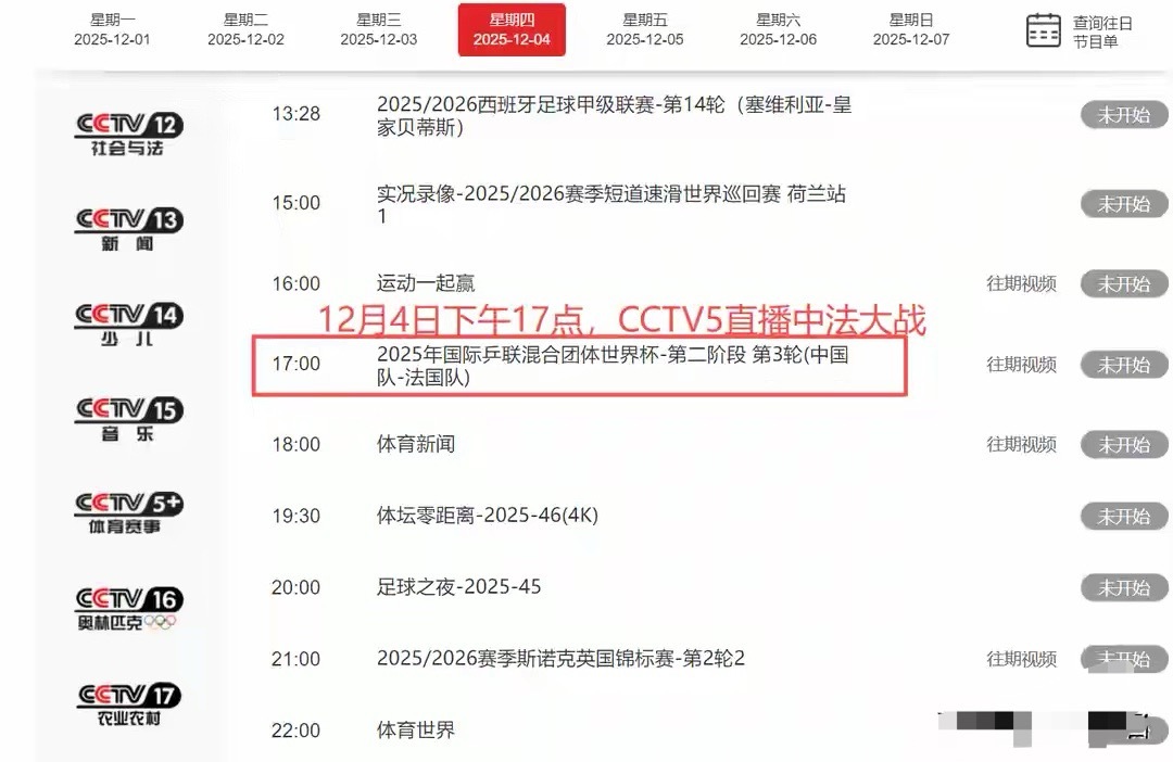 调整!12月4日下午央视直播乒乓中法大战有变,王楚钦大战勒布伦北京时间12月4日,乒乓球混团世界杯第5个比赛日,第二阶段的比赛继续进行!在今天上午结束的一场比赛中,国乒8-0轻松击败韩国。本场比赛,教练组继续变阵,林诗栋/蒯曼搭档混双,王曼昱出战女单,王楚钦男单,没有太大悬念,三盘比赛全部横扫,不给韩国球员一点拿分的机会!赛后采访,林诗栋和蒯曼出镜,谈到帮助球队击败韩国,蒯曼表示发挥比较正常,赛前的准备也很充分!林诗栋认为后面的对手越来越强,不管面对谁都会全力以赴!王楚钦感谢了林诗栋、蒯曼和王曼昱,他们开了一个好势头,然后让自己的压力小很多,安宰贤打得不错,自己拿下第一局后,让心态获得了释放!王曼昱同样称赞了对手李恩惠,接下来会继续调整,每天观众都很多,小组赛都是爆满,很高兴这么多人来给中国队加油!值得一提的是,今天国乒是1天2赛,孙颖莎在上午的比赛没有出场,也是在为下午的中法大战做准备!预计王楚钦还是出战男单,他现在的状态非常好,比林诗栋、梁靖崑更稳定一些,不过连续出战对体能的要求比较大,希望大头在这几个小时好好休息!根据赛程安排,中法大战在下午17点00进行!法国队的阵容由勒布伦兄弟领衔,他们二人的实力自然不弱,可以和国乒主力抗衡,但法国的帕瓦德、袁嘉楠表现比较一般,此前法国7-8惜败韩国,袁嘉楠0-3被李恩惠横扫,在女双比赛中,袁嘉楠/帕瓦德也输给对手!这场中法大战,比较大的看点是男单王楚钦和勒布伦之间的对决,大头想要继续保持不败,需要早早进入状态,主动给对手施压,开局占据上风很关键!中央5台的直播安排相比上一个比赛日也有调整!昨天国乒的比赛,由CCTV5+进行转播,而到这个比赛日,中韩大战和中法大战,都是由CCTV5全程直播。据央视节目单,在12月4日下午17点00,CCTV5继续转播国乒和法国的混团比赛,球迷们记得准时收看,支持中国队!国乒在晚间没有比赛,不过CCTV5+仍旧会转播乒乓球。在晚间19点00,混团世界杯德国队大战克罗地亚,CCTV5+全程直播!