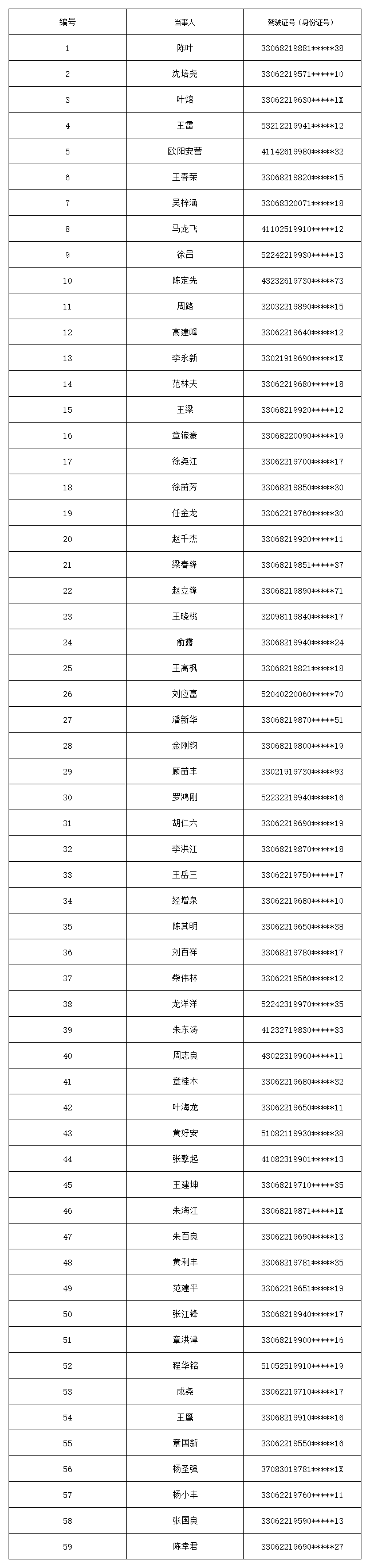 下列驾驶人因涉嫌实施交通违法行为,被查获后无正当理由未在规定期限内接受处理,根据《中华人民共和国道路交通安全法》第九十一条第一款,第九十九条第一款,第一百一十条第二款等之规定,将依法予以罚款、吊销机动车驾驶证等处罚。根据《中华人民共和国行政处罚法》第四十四条规定,当事人有权进行陈述、申辩,符合条件的可以要求听证。如有陈述和申辩,应于公告发布之日起七日内向通知处理单位提出;要求听证的,应于公告发布之日起十二日内向绍兴市公安局交通管理支队提出,逾期视为放弃听证。特此公告。