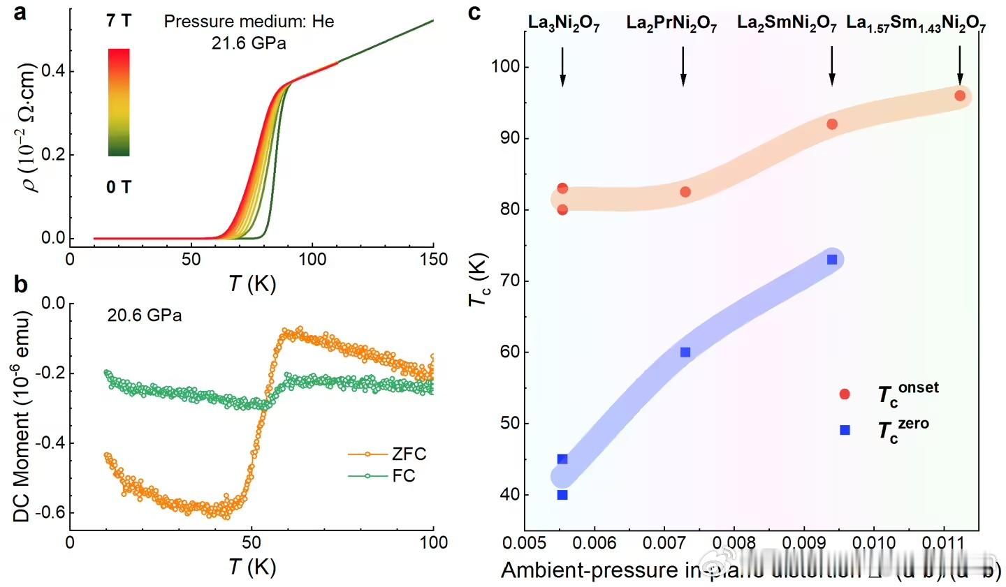 我国科学家创造镍基超导体转变温度新纪录 北京高压科学研究中心曾桥石团队联合山东大学张俊杰团队,在双层镍酸盐体系中取得了重要进展:在高质量的 La₂SmNi₂O7-d 单晶中,通过高压诱导实现了高达 96 K 的体超导转变,创造了迄今镍基超导体的最高转变温度的纪录。相关成果今日已发表在《自然》上。该材料在高压环境下实现 96K(-177.15℃)超导转变温度,刷新镍酸盐体系超导温度纪录,成为继铜基、铁基之后的第三类非常规高温超导体。研究团队创新采用“常压熔剂法”制备技术,通过优化化学成分设计产生“化学压力”,成功获得高纯度、低缺陷的镍酸盐单晶样品。针对微米级样品的高压测量难题,团队自主开发等静水压电阻与磁测量技术,在维持晶体结构完整性的前提下,同步验证了零电阻与完全抗磁性两大超导特征。该成果将镍基超导温度首次提升至液氮温区(77K)以上,为探索更高温超导体奠定基础。曾桥石研究员表示:“此次突破使‘百 K 超导’目标更近一步,推动常温超导应用从理论迈向现实。”研究成果以《Bulk superconductivity up to 96 K in pressurized nickelate single crystals》为题发表于 Nature(网页链接