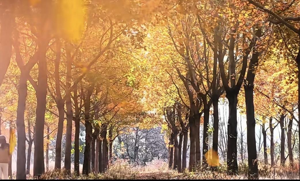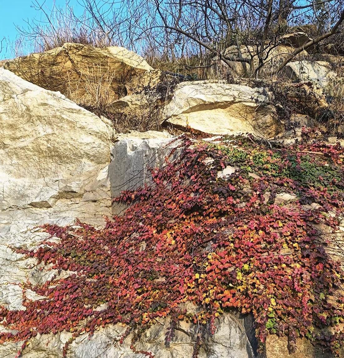 冬初秋末的苏北风景长啥样? 第一张是仰拍的秋叶特写:橙红、金黄的枫叶(或类似叶形的秋叶)挤满画面,衬着澄澈的蓝天,阳光把叶片照得透亮,连细小的树枝和果实都清晰可见,像把秋天的色彩揉进了晴空里。 第二张是秋日林间小径:两排高大的树木枝叶泛黄,在头顶交织成暖黄色的“隧道”,地面落着枯草,光线柔和地洒下来,隐约能看到远处的人影,走进去应该满是秋意的温柔。 第三张是石崖上的爬山虎:灰白的岩石坡上,爬满了红、紫、黄相间的爬山虎叶,深浅交织的色彩裹住了冷峻的石头,旁边还有干枯的杂草和光秃的树枝,冷硬的岩石和热烈的秋叶形成了鲜明的秋日对比。 (图文陈士健)