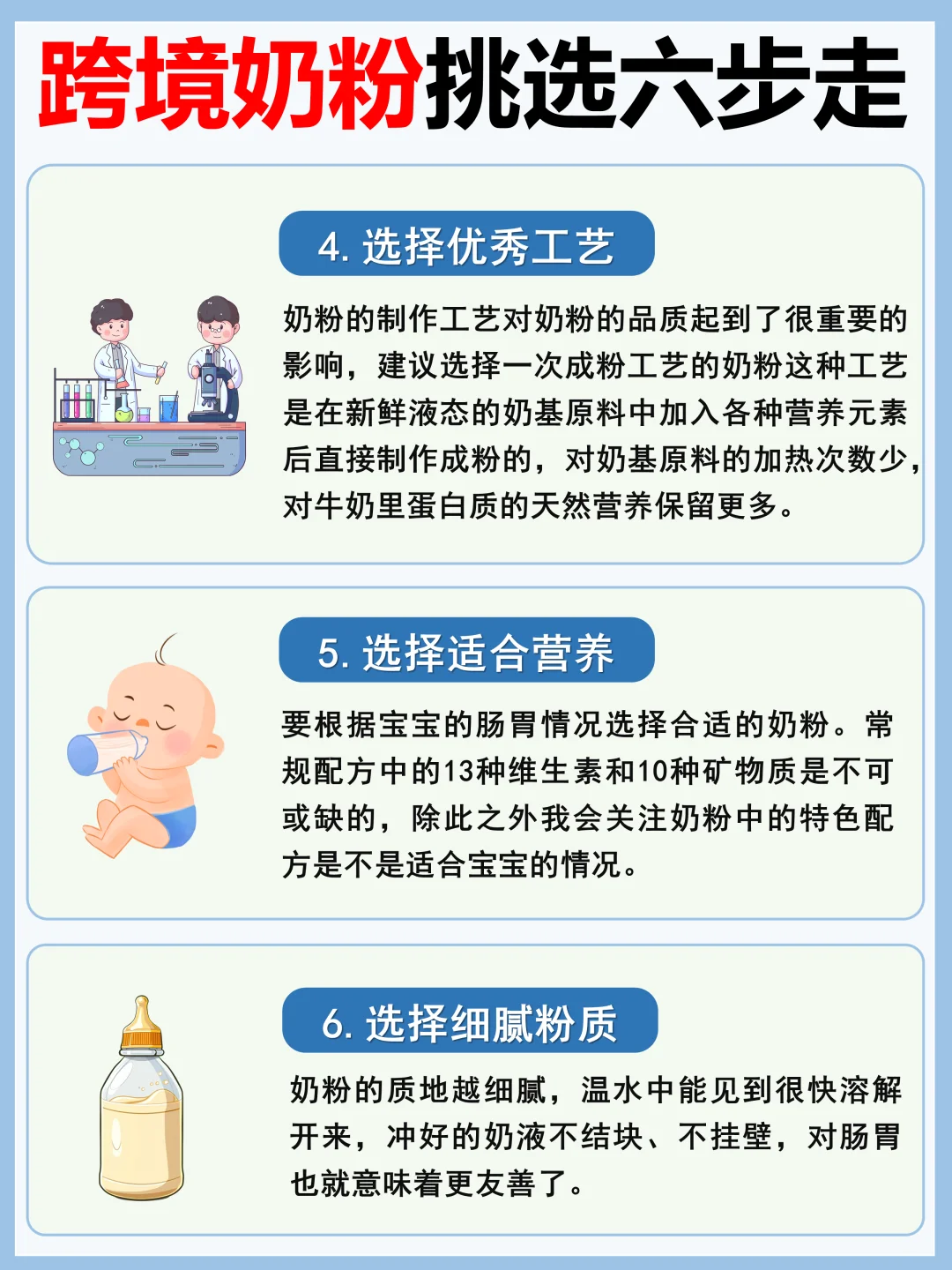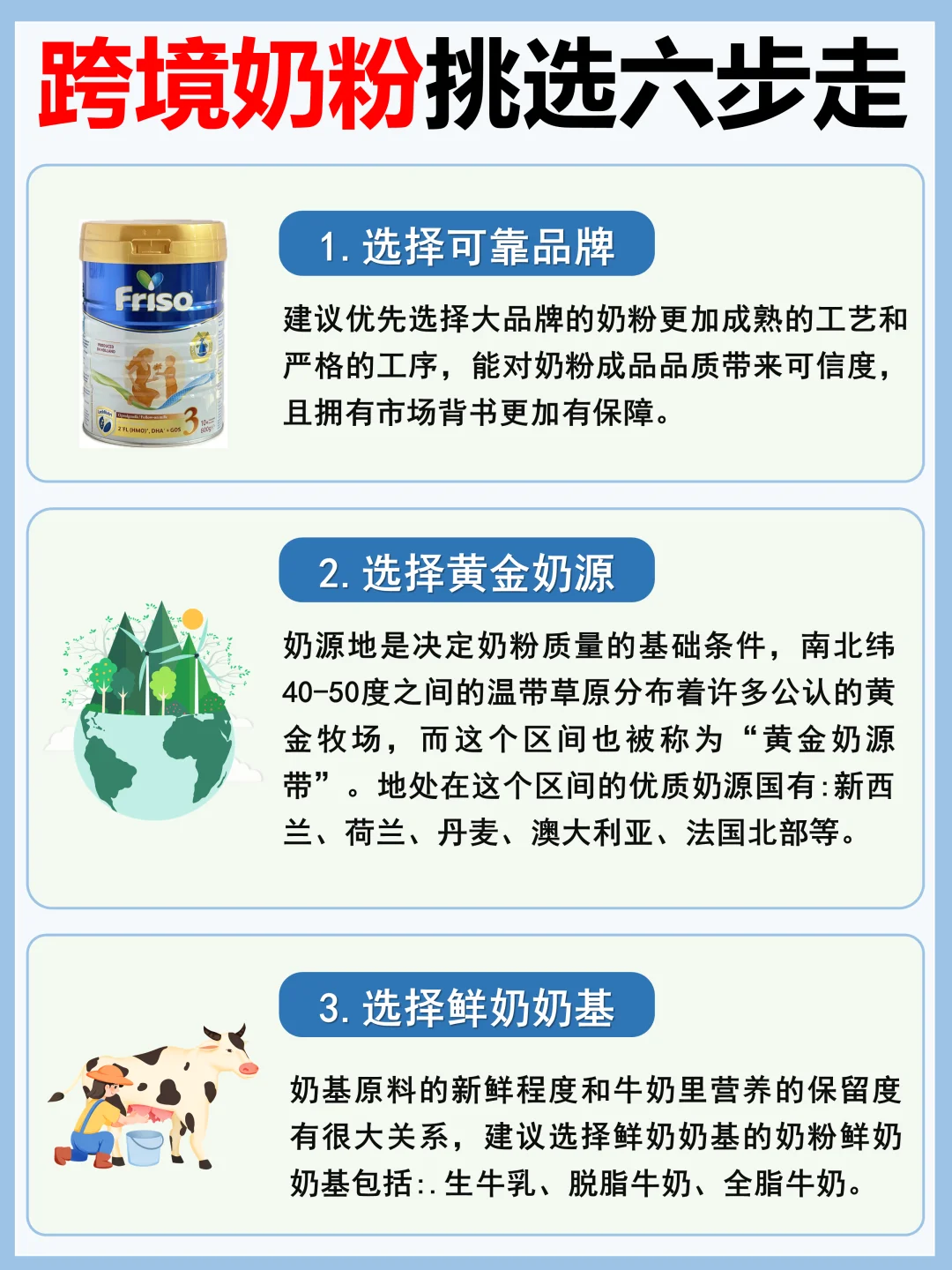 现在很多家庭会给孩子选择跨境奶粉,跨境奶粉是国外奶粉品牌使用国外奶源在国外加工生成,主要在生产国、奶源国当地销售的奶粉。外包装都是外文,通过跨境电商等模式进入国内,在品质把控上更让人放心。也有妈妈问我宝宝喝什么样的跨境奶粉?今天给大家整理了几个选购的要点,给大家做个参考: