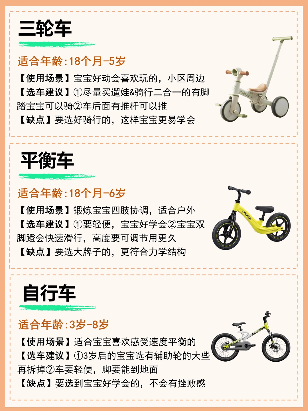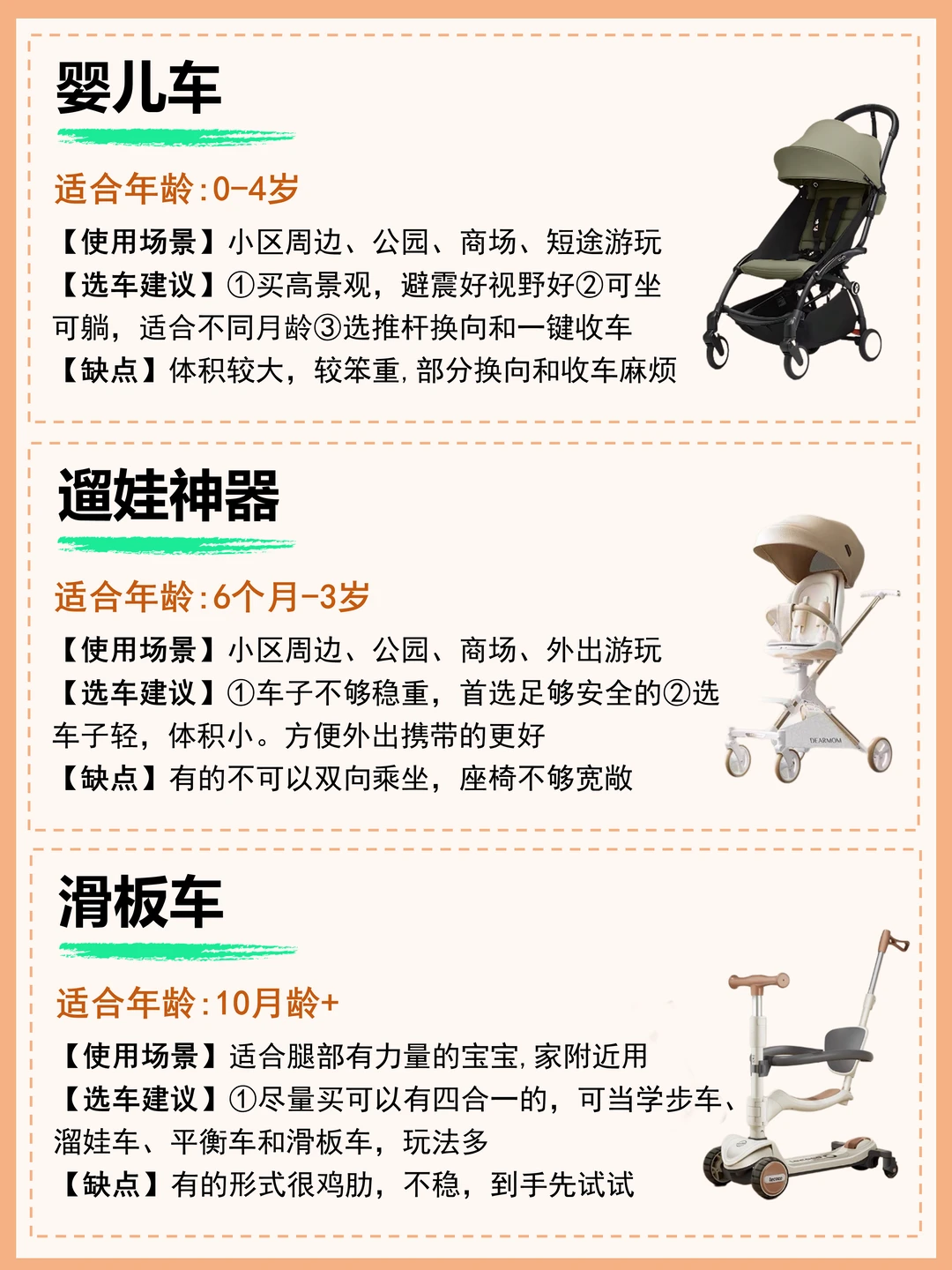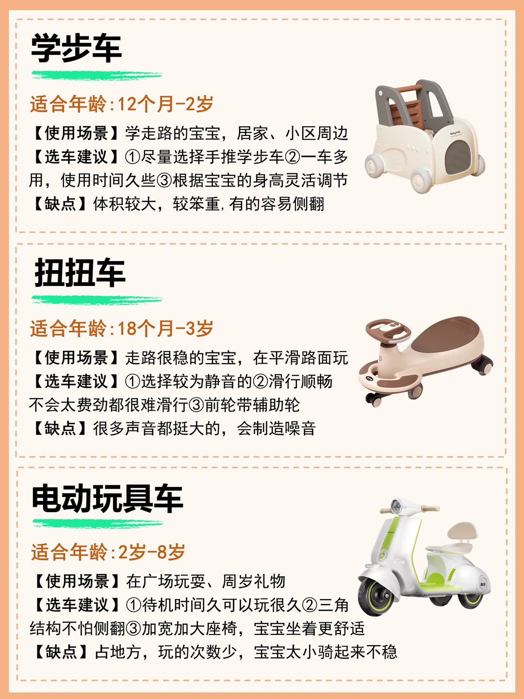宝宝成长路上,肯定少不了要买各种各样的车车🚗。我家宝宝3岁了,家里各种车车已经有十几辆了。蕞近根据日常使用经验做了一篇童车攻略,希望能帮到大家选购到好玩、性价比高、使用时间久的童车! . [红色心形R]宝宝车车使用时间顺序:婴儿车→遛娃神器→围栏滑板车→学步车→扭扭车→电动玩具车→三轮车→平衡车→自行车 . 每款车车的使用时间、用途、选购建也整理在图了,建议宝妈宝爸们不要超龄购买宝宝车哦,不然容易闲置。