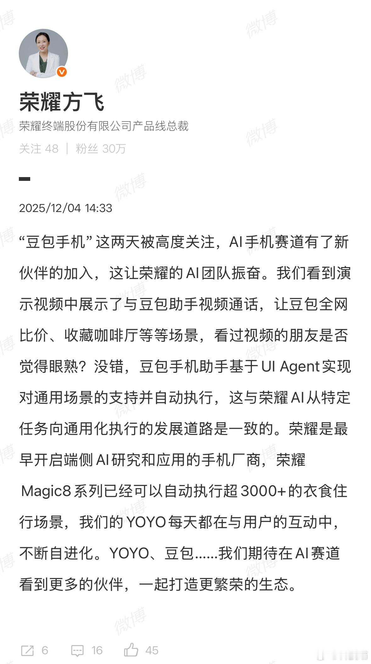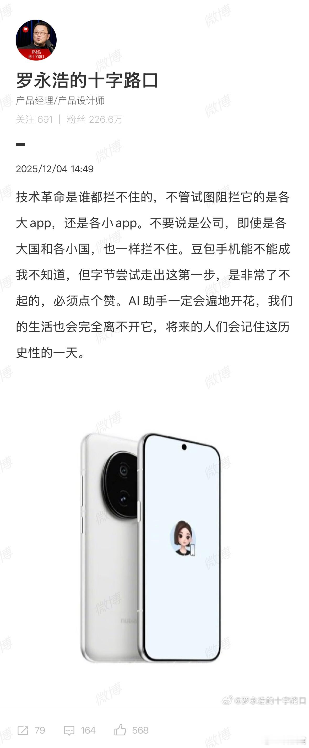 荣耀罗巍个人观点:不看好字节做手机。荣耀方飞:“豆包手机”加入AI手机赛道,这让荣耀的AI团队振奋。罗永浩:豆包手机能不能成我不知道,但字节尝试走出这第一步,是非常了不起的,必须点个赞。科技喵:字节自己不做手机,想要和手机厂商合作推广豆包手机助手,这条路比较艰难。 罗永浩谈豆包手机
