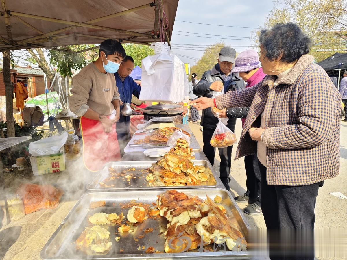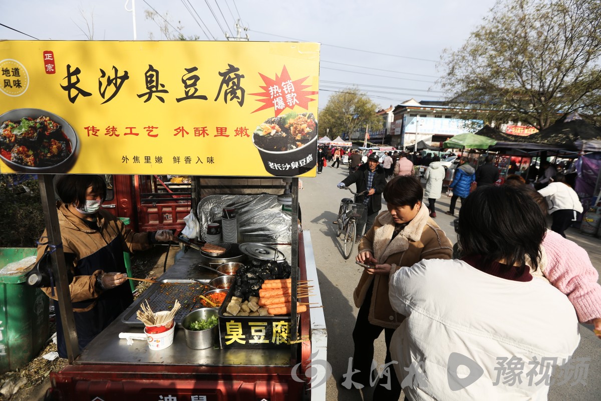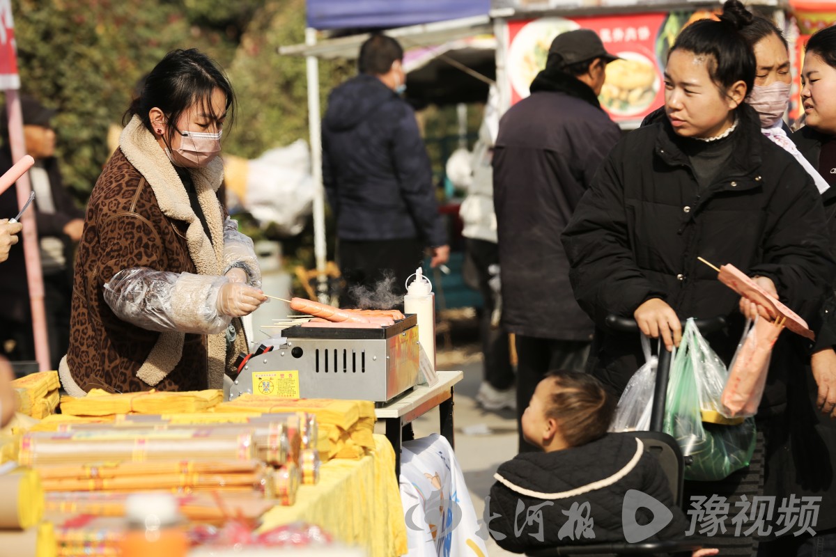 “2块、2块,全场都2块!”“臭豆腐,长沙臭豆腐”“油炸毛鸡蛋,五香哩、麻辣哩”……庙会上的热闹,离不开丰富的商品和诱人的小吃。一路走去,卖衣帽服装的、五金杂货的、电子产品的应有尽有,仿佛从城市里“搬”来了几条街道。而飘散着香味的各种特色小吃,则更是人们的喜爱,每每引得逛会的乡亲们停下脚步。炒凉粉、浆面条、胡辣汤、灌汤包,这些来自于民间的小吃,以烟火气的方式又一次与民间相遇,丰富着乡亲们的味蕾。