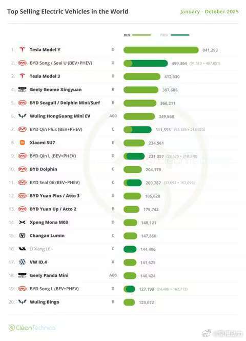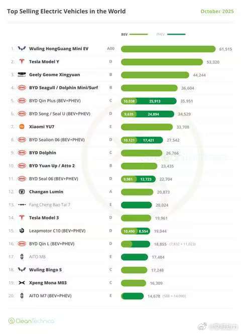 10月全球最畅销电动车,Model Y不敌五菱宏光MINI EV10月全球20款最畅销电动汽车榜单出炉,五菱宏光MINI EV以61515台位列第一,特斯拉Model Y以53320台位列第二,吉利星愿排名第三。前十个月累计销量排名,特斯拉两款车依旧是冠军和季军,比亚迪宋排名第二。车企排名中,前三甲分别被中国品牌包揽,比亚迪、吉利和五菱位列冠亚季军,特斯拉排名第四。
