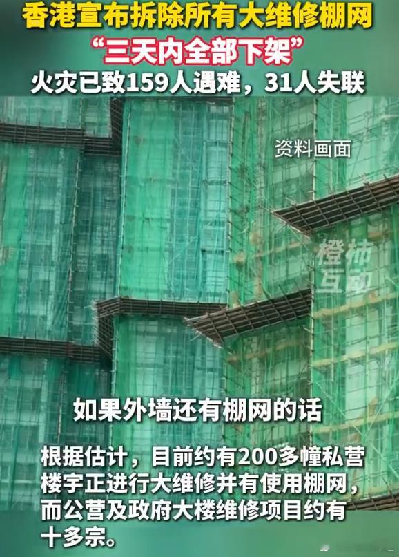 香港宣布拆除所有大维修的楼宇棚网 这次香港建筑物燃烧主要是引燃了窗沿和外墙的发泡塑料保温层。绿网用的是阻燃材料,应该不是火灾的主要原因吧竹子脚手架比棚网看起来危险