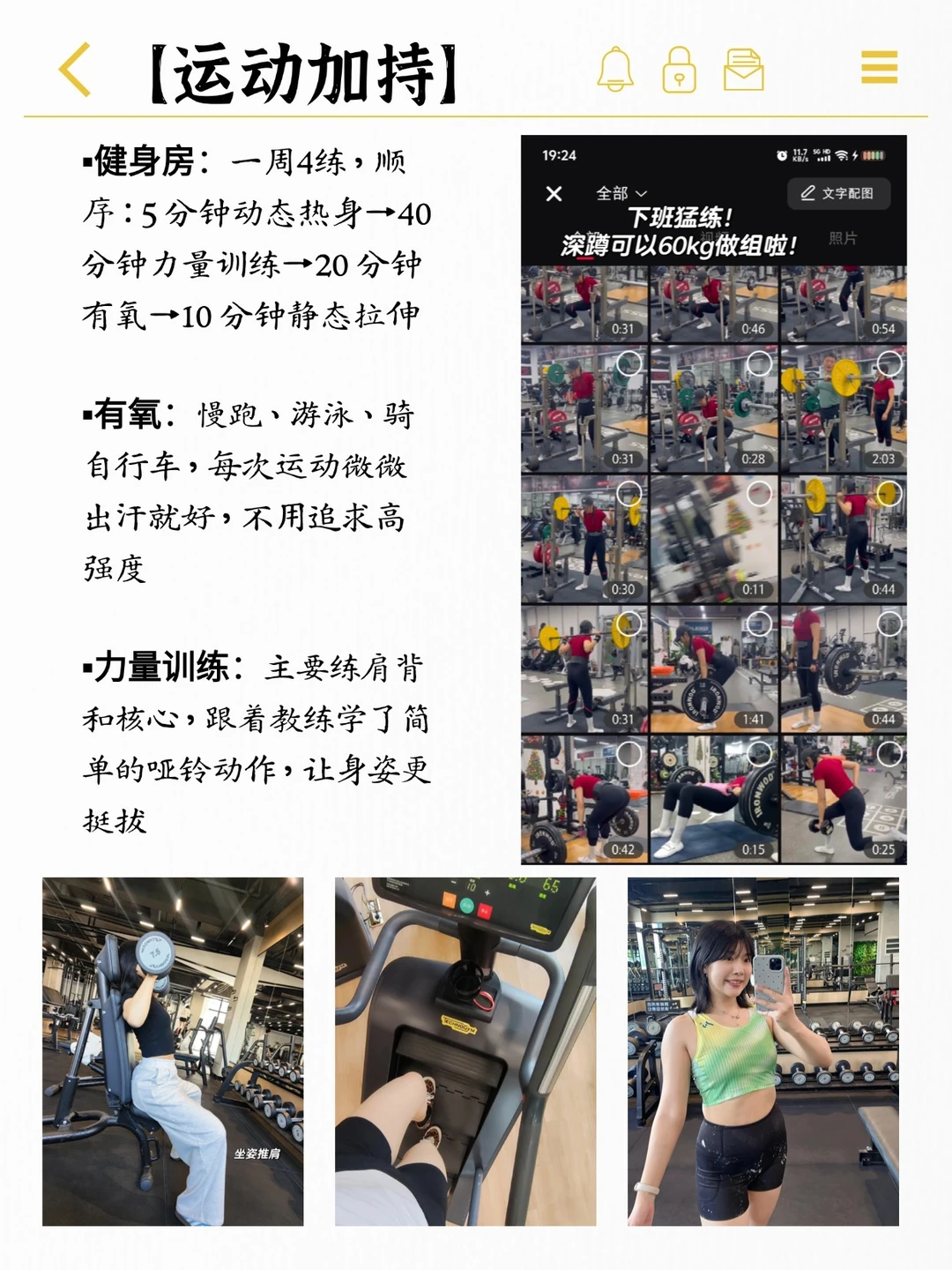 ▪健身房:一周4练,顺序:5 分钟动态热身→40 分钟力量训练→20 分钟有氧→10 分钟静态拉伸