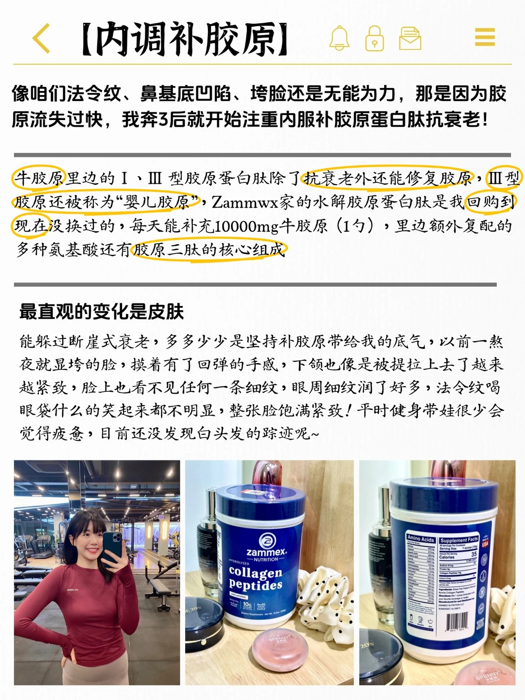 ▪牛胶原里边的Ⅰ、Ⅲ 型胶原蛋白肽除了抗衰老外还能修复胶原,Ⅲ型胶原还被称为“婴儿胶原”,Zammwx家的水解胶原蛋白肽是我回购到现在没换过的,每天能补充10000mg牛胶原(10g),里边额外复配的多种氨基酸还有胶原三肽的核心组成!