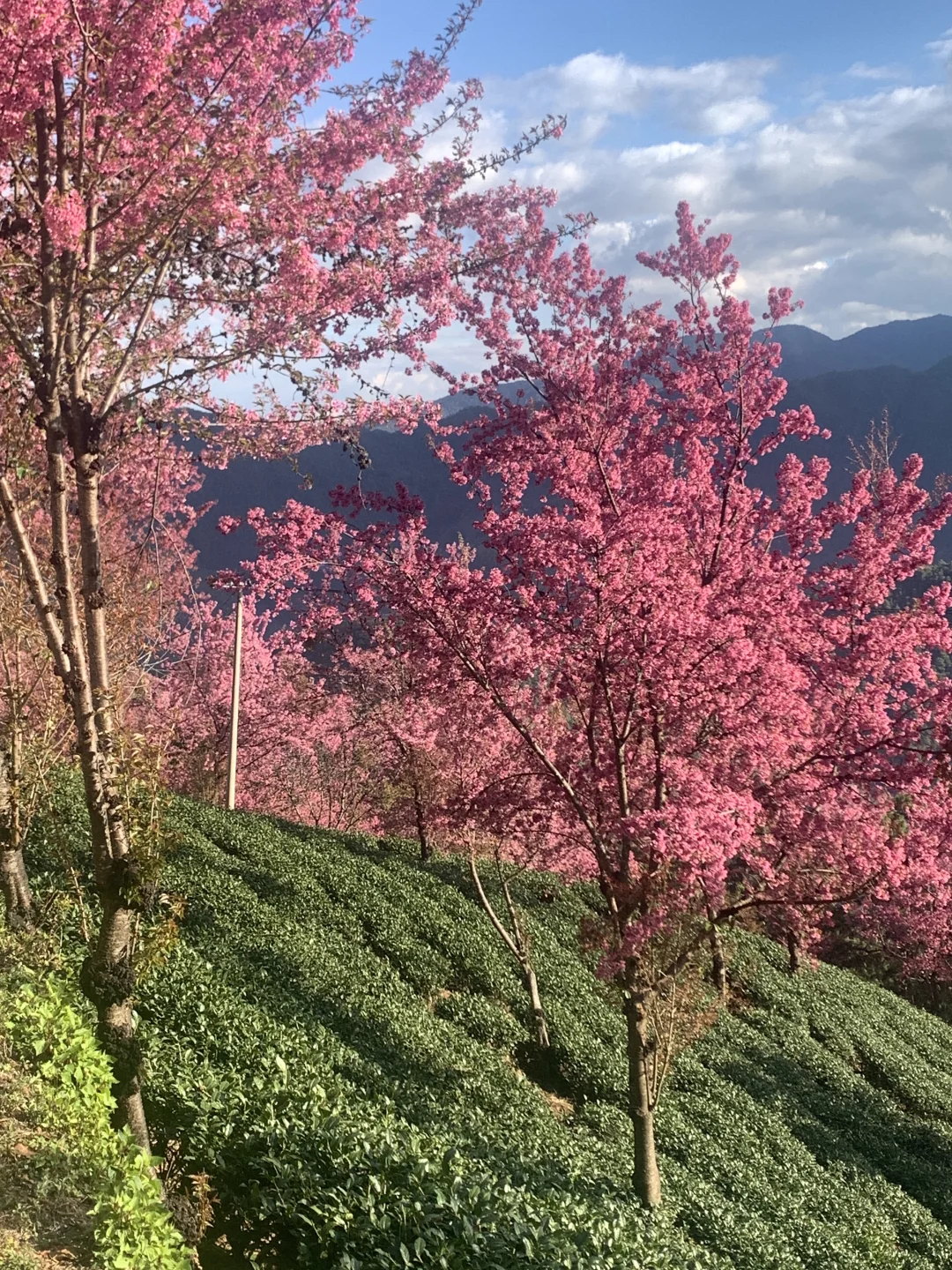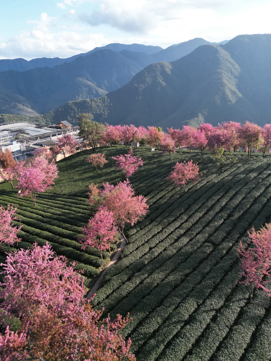 翠绿茶田映衬着粉色樱花,航拍视角绝了