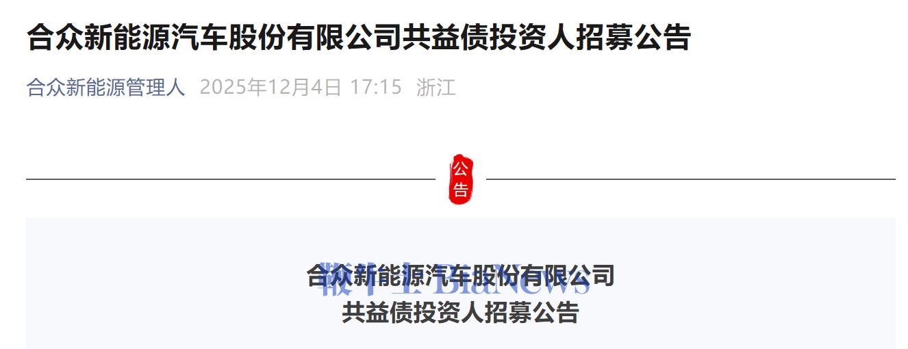 今日,哪吒汽车母公司合众新能源发布共益债投资人招募公告。