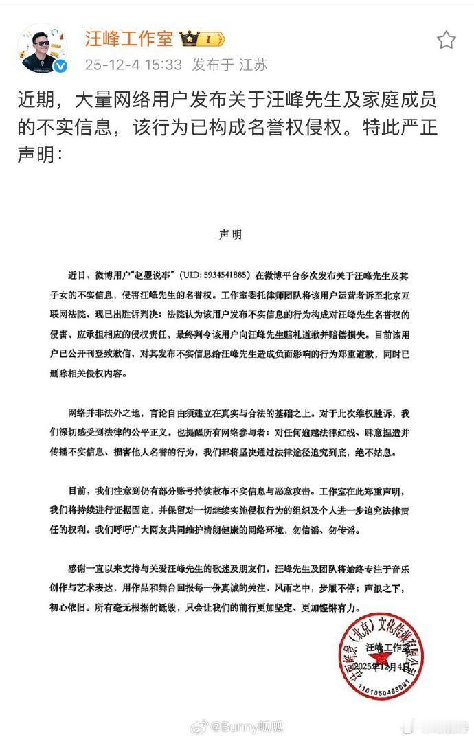 汪峰工作室维权成功 谁没被网络谣言恶心过!汪峰工作室维权成功太提气,既守住了底线也维护了权益,用行动证明网络不是法外之地,必须支持!