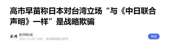 12月3日的日本参议院全体会议上,首相高市早苗的一段话被中日两国媒体都圈了出来。 这位日本历史上首位女首相明确表态,日本政府关于台湾的基本立场,完全基于《日中联合声明》,从来没有过一丝一毫的改变。 尤其是提到中华人民共和国政府明确台湾是中国领土不可分割的一部分时,她特意强调,日本政府充分理解并尊重这一立场,而且会一直坚持下去。 这话听着平实,分量可一点不轻。要知道高市早苗在日本政坛以保守强硬著称,之前因为一些涉台言论还曾引发过中日关系的小波澜。 这次在参议院这种正式场合公开重申立场,明眼人都能看出其中的信号——不管日本国内政治怎么变,中日关系的这条核心底线不能乱。 很多人可能不清楚,《日中联合声明》里的这段表述,可不是空口白牙的承诺,是1972年中日建交时就钉下来的“压舱石”。当时中方提出的“复交三原则”里,就明确要求日本承认台湾是中国领土的一部分,废除非法的“日蒋条约”。 日本方面在联合声明里写得清清楚楚,不仅承认中华人民共和国政府是中国唯一合法政府,还特别提到遵循《波茨坦公告》第八条的立场——这一条的核心就是台湾必须归还中国。 后来的《日中和平友好条约》《中日联合宣言》等几个重要文件,都一次次重申了这个立场,等于把这事儿从外交共识变成了具有国际法效力的承诺。 为啥现在要特意强调这个?看看最近的情况就明白。台湾岛上的“台独”势力总想着搞点小动作,外部也有势力想借台湾问题做文章,这时候日本作为近邻,它的立场表态就格外关键。 高市早苗这番话,等于给日本国内一些蠢蠢欲动的声音划了条红线,也给地区局势送了个明确的信号:别想把日本拖进台湾问题的浑水里。 不过话说回来,听其言更要观其行。就在一个月前,外交部发言人还曾批评过日方在台湾问题上“口头上搪塞敷衍,行动上一意孤行”。 当时有日本官员拿所谓“旧金山和约”说事儿,避而不谈《开罗宣言》《波茨坦公告》这些明确台湾归属的国际法文件,让人很是警惕。 毕竟这些年,日本在安保政策上动作不少,防卫预算一涨再涨,有时候还会和美国搞些涉及台海的军事演习,这些行动和“尊重中国立场”的表态要是对不上号,难免让人心里打鼓。 中国外交部之前就说得很明白,不管日本哪个党派、哪个人当政,都必须守住这个底线。中日关系这些年起起伏伏,好的时候能在经济、环保上好好合作,闹矛盾往往都是因为历史问题和台湾问题这些核心关切。 高市早苗现在重申立场,算是找对了方向,但关键还得看后续怎么做。别再搞什么台日官方往来,别向台湾出售武器,别跟着别人喊什么支持台湾,这些实际行动比再多的表态都管用。 对咱们中国人来说,台湾问题从来都是核心利益中的核心,没有任何商量的余地。日本作为曾经侵略过台湾的国家,更应该清楚这段历史,明白台湾回归中国是二战后国际秩序的重要组成部分,不是谁想动就能动的。 高市早苗在参议院的这番话,至少让人们看到日本政府在这个大是大非问题上还保持着清醒,这是好事。当然,也不用因为这几句话就掉以轻心。 中日关系里的变量不少,高市早苗本人的政治立场也一直偏保守。但有一点是肯定的,只要日本守住《日中联合声明》的底线,不在台湾问题上越雷池一步,中日之间就有合作的基础。 要是敢突破这个底线,别说合作了,之前积累的友好成果都可能付诸东流。台湾是中国的家事,轮不到外人指手画脚。高市早苗的表态,本质上是日本政府对中日关系政治基础的再确认。 希望这份确认不只是停在参议院的发言席上,更能落实到每一次外交决策、每一个实际行动中。毕竟,稳定的中日关系,既符合中国的利益,也符合日本的利益,更是地区和平的重要保障。