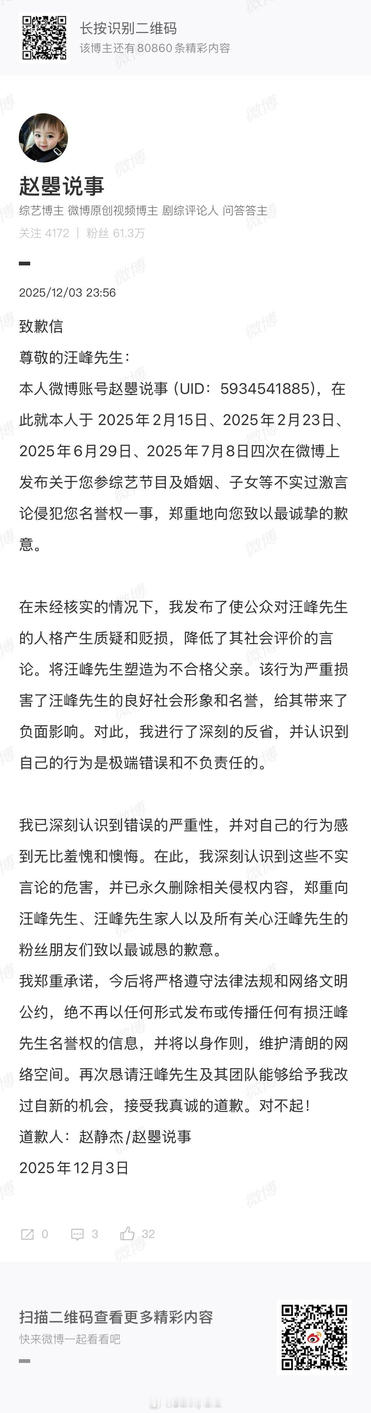 汪峰工作室维权成功 这次汪峰工作室的维权成功真的太有意义了,给那些乱造谣的人一个明确的警示。每个人都应该为自己的言行负责,网络不是法外之地,支持正义,守护家人,做事有底线,大家一起抵制网络暴力!