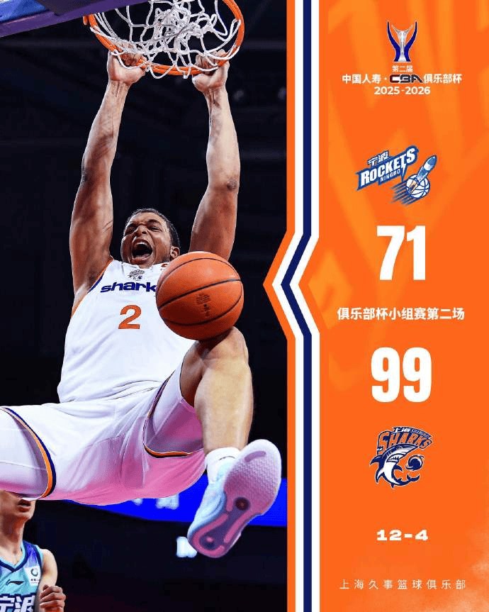 2025年12月4日,第二届CBA俱乐部杯B组小组赛第二场,上海久事99-71宁波町渥,锁定B组上半区第1名。