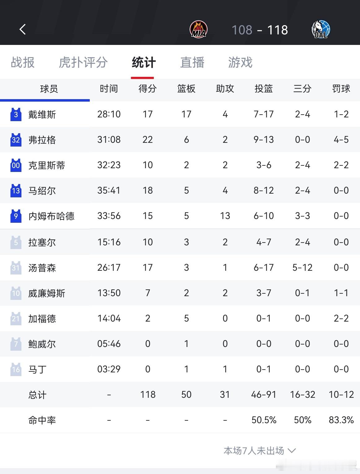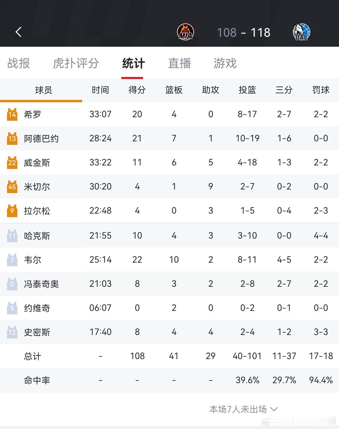 独行侠118-108战胜热火,取得三连胜浓眉17分17板3封盖,弗拉格22分,内姆布哈德15分13助,球队7人得分上双热火vs独行侠