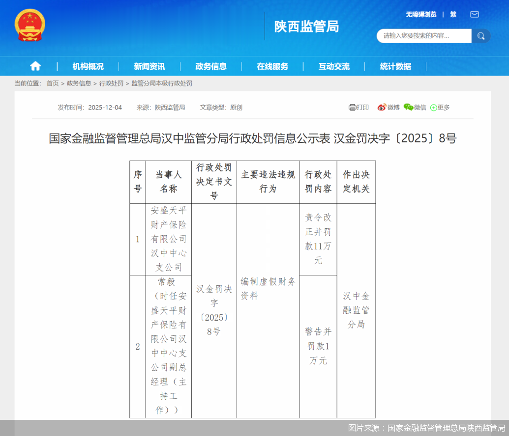 北京商报讯(记者李秀梅)12月4日,国家金融监督管理总局陕西监管局发布行政处罚信息显示,安盛天平财产保险有限公司汉中中心支公司,因编制虚假财务资料,被责令改正并罚款11万元;时任安盛天平财产保险有限公司汉中中心支公司副总经理(主持工作)常毅,被警告并罚款1万元。