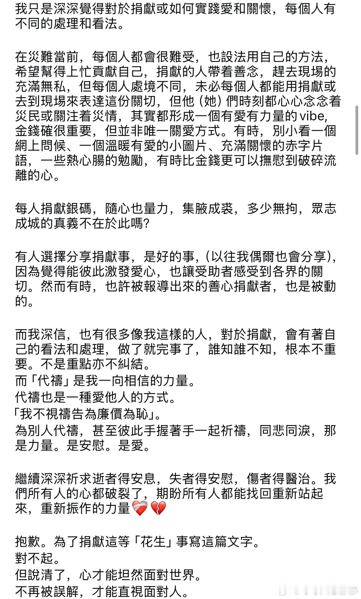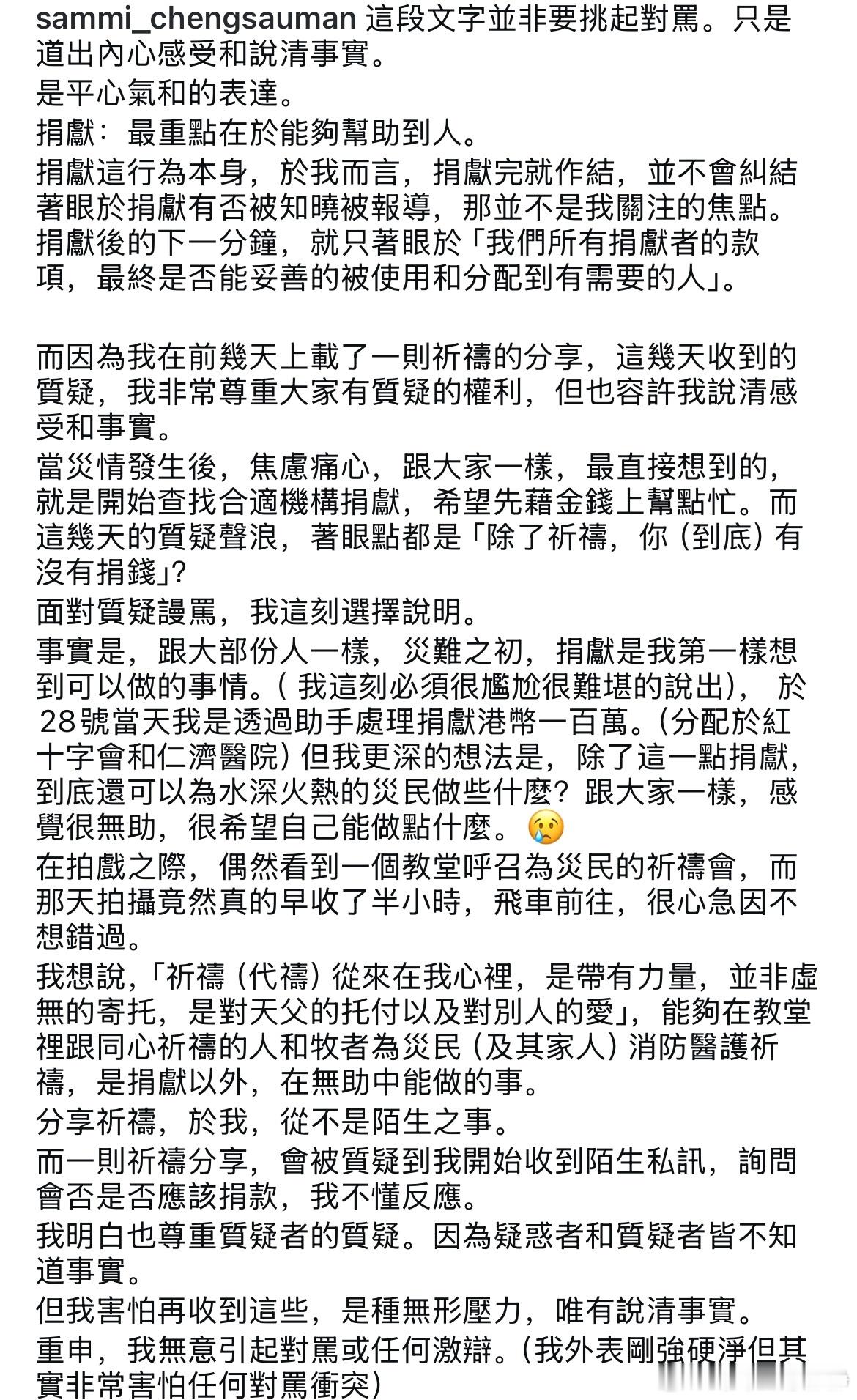 郑秀文被一些人网暴质疑她没有捐款,本想默默为遇难者做事,逼得人家还要发文澄清。28号当天就已捐款100万港币,还为灾民祈祷郑秀文回应捐款键盘侠就是成天闲的没事干这种喜欢表演正义的人往往带着最大的恶意去揣测他人