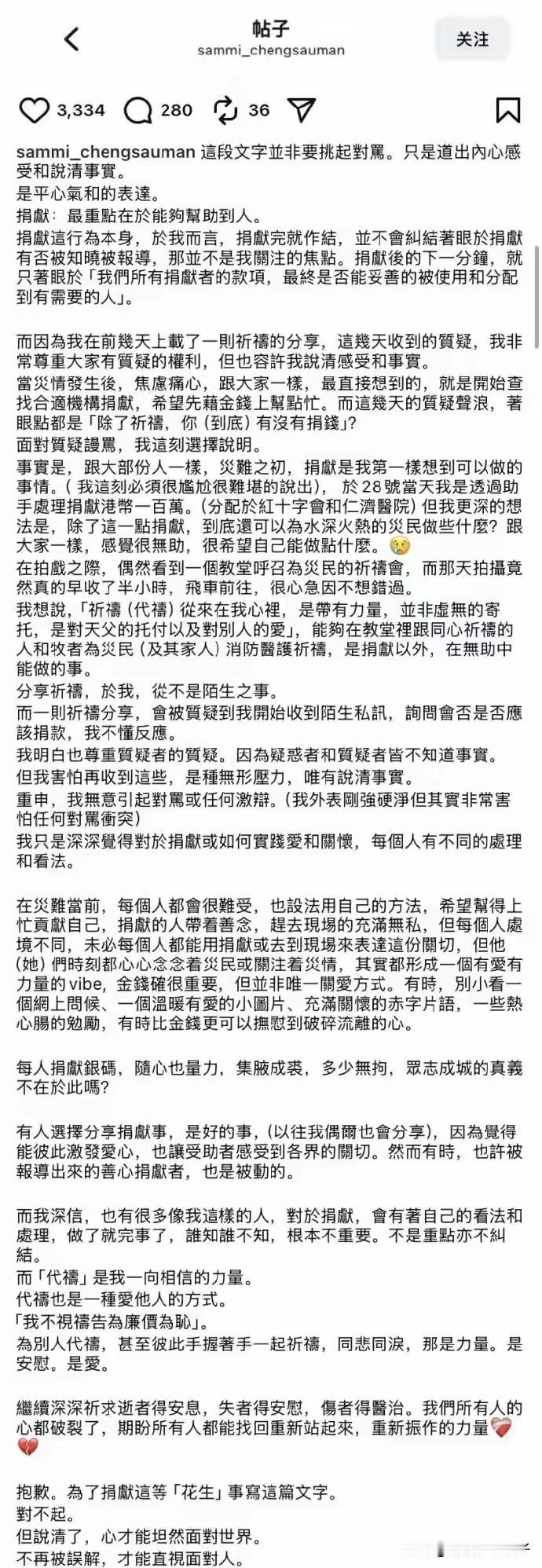 看来明星捐赠善款,真的有必要晒出回执单了! 香港火灾,很多明星捐赠善款,伸出援助之手,这是一份爱心,也是一份责任。 然而,歌手郑秀文却被质疑:只是祈祷却不捐钱。 对此,特意发文回应,看了文案,觉得郑秀文的思想境界很高,确实,捐赠的重点在于能够帮助别人,而不是炫耀。 万万没想到,郑秀文很早就捐赠了一百万港币,由于没有公布,结果遭到误解和质疑,最后写了长文来解释,心情可想而知。 话说,那些提出质疑的网友,此刻应该感到非常羞愧吧,永远不应该怀疑一个善良有爱心的人。 照这样看来,明星捐赠善款,真的有必要晒出回执单,以免被质疑。 其实,明星捐赠是一份爱心,值得称赞,就算没有捐赠,也不应该道德绑架,毕竟,善举可以有很多方式。