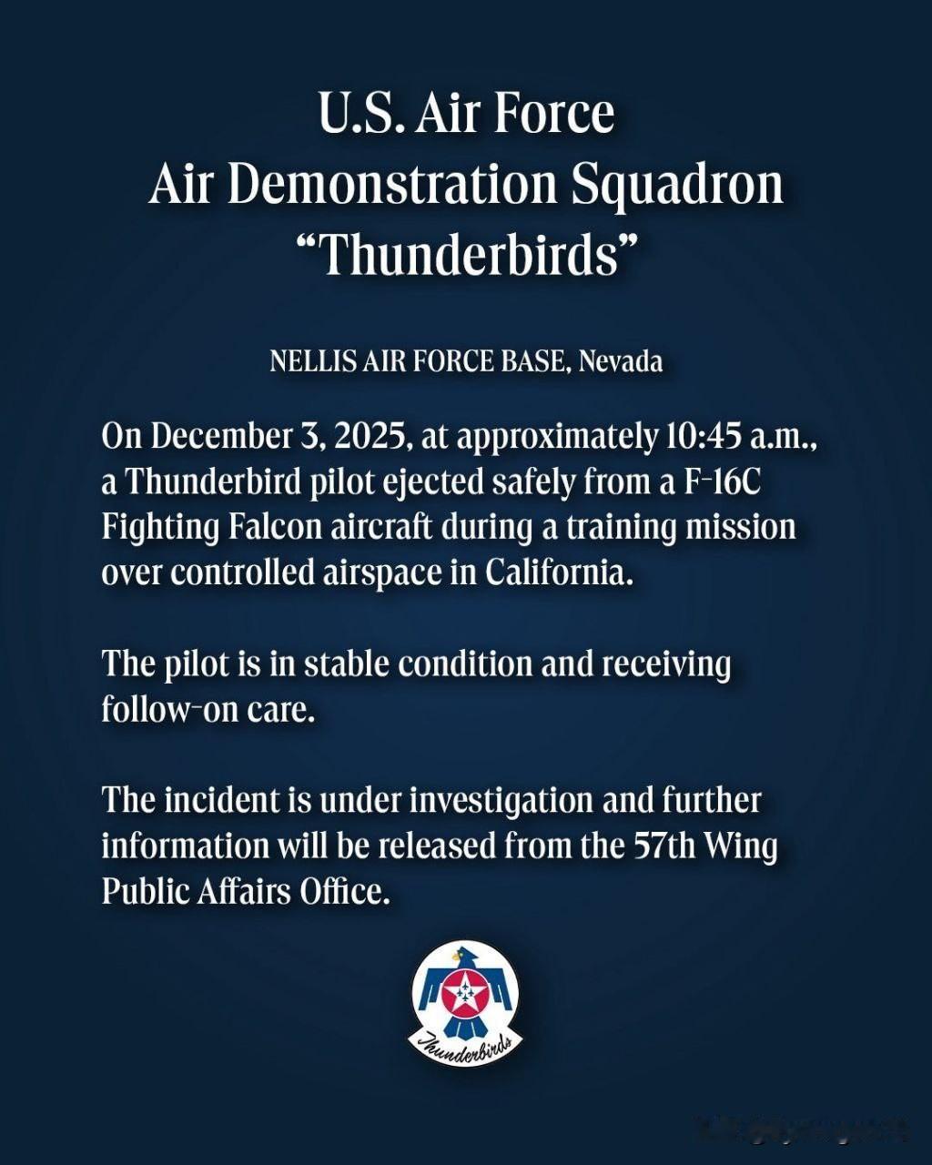 ✈️🇺🇸 一架美国空军战斗机在加州沙漠进行训练飞行时坠毁。 这架隶属于美国空军雷鸟特技飞行表演队(内华达州内利斯空军基地)的F-16C战斗机飞行员于12月3日在美国加利福尼亚州圣贝纳迪诺县特罗纳附近坠毁,他弹射逃生后幸存。 🔷事故发生在当地时间上午10点45分),当时飞机正在管制空域进行例行训练。据圣贝纳迪诺县消防局称,飞行员已被送往医院,伤势无生命危险。