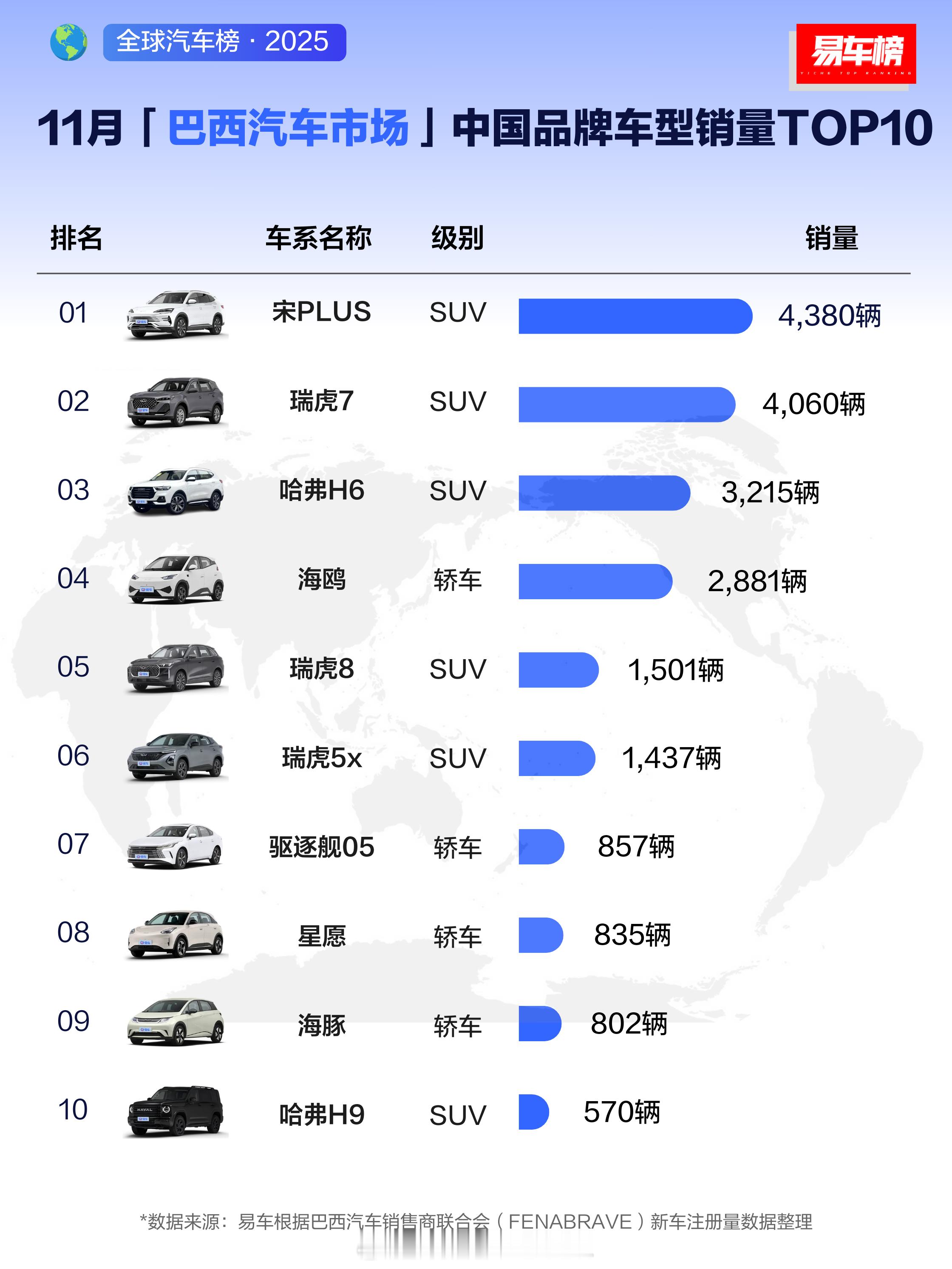 看到易车一个数据,巴西汽车市场现在的前六名还是外国品牌,大众、菲亚特、通用、现代、Jeep、雷诺,中国品牌比亚迪排第六,奇瑞排第九,巴西卖得最好的十款中国车里有四款比亚迪的,三款奇瑞的,两款哈弗的,一款吉利星愿的。巴西卖得最好的十款中国车