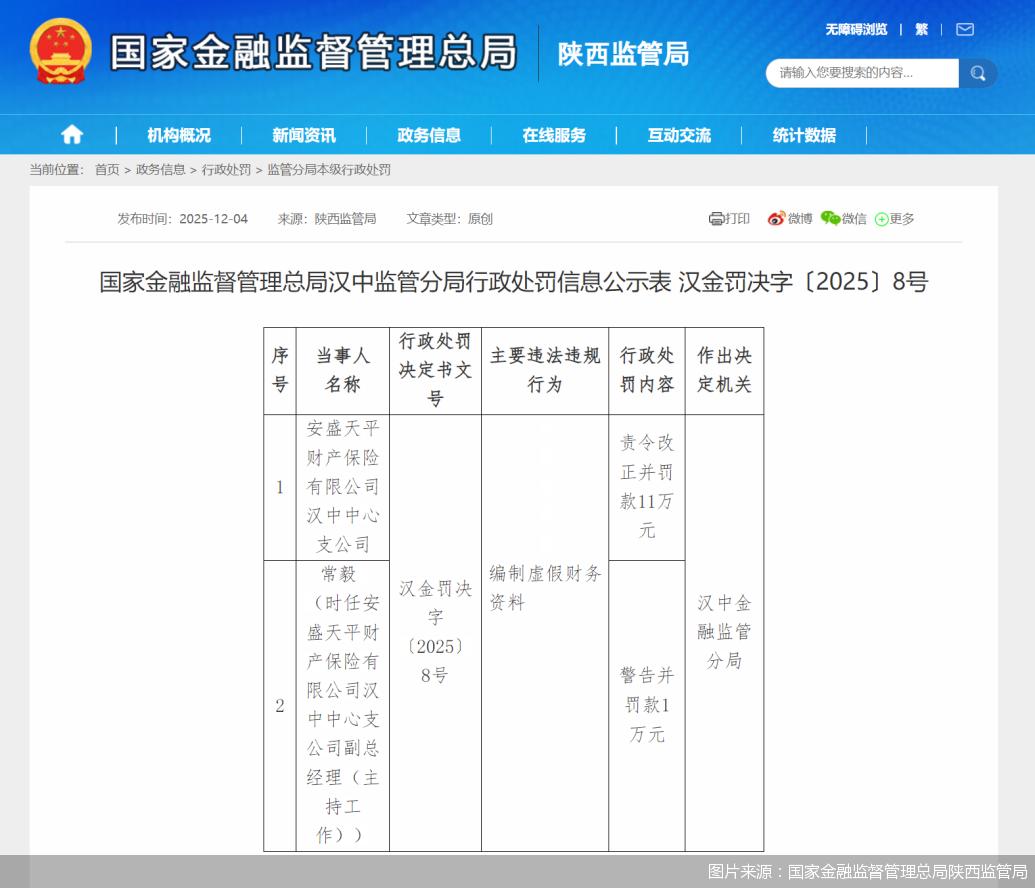 北京商报讯(记者李秀梅)12月4日,国家金融监督管理总局陕西监管局发布行政处罚信息显示,安盛天平财产保险有限公司汉中中心支公司,因编制虚假财务资料,被责令改正并罚款11万元;时任安盛天平财产保险有限公司汉中中心支公司副总经理(主持工作)常毅,被警告并罚款1万元。