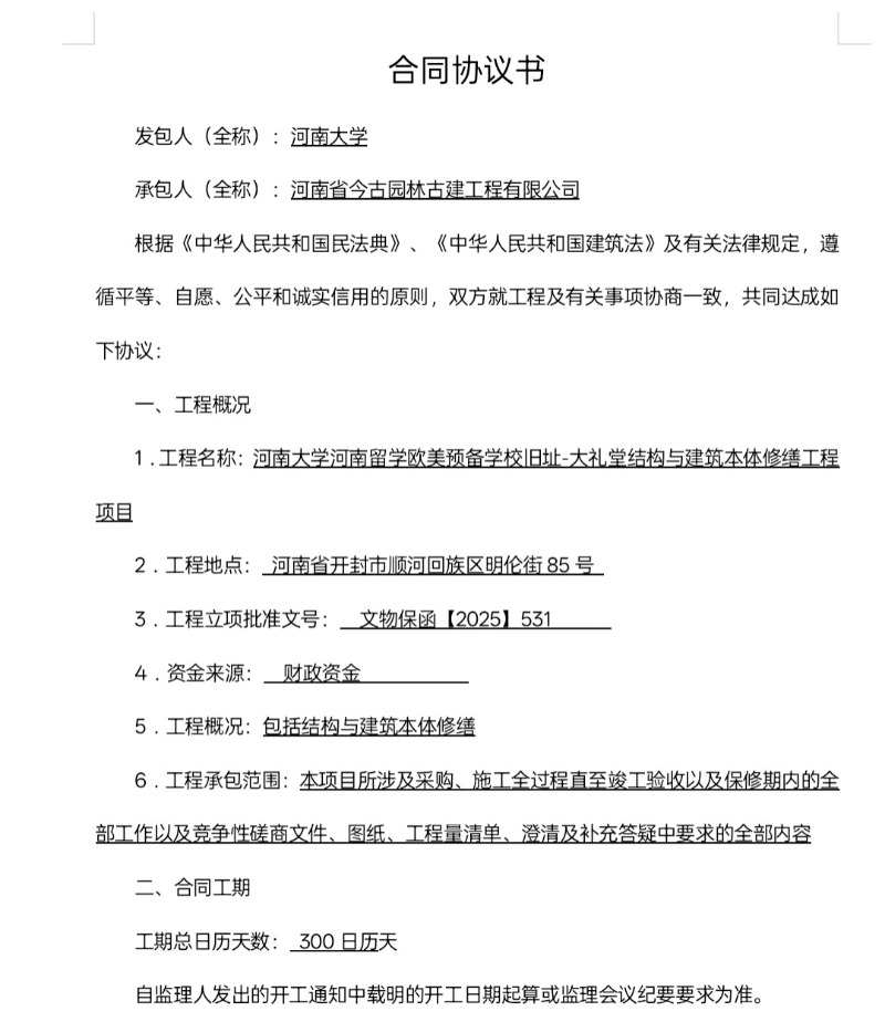 公开的《合同协议书》显示,发包人为河南大学,承包人为河南省今古园林古建工程有限公司,签约合同价为20563930.21元,资金来源为财政资金。合同于8月25日签订。