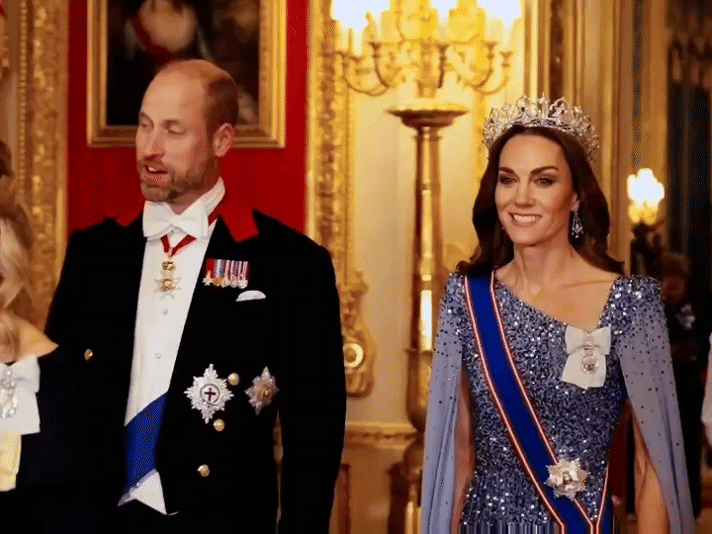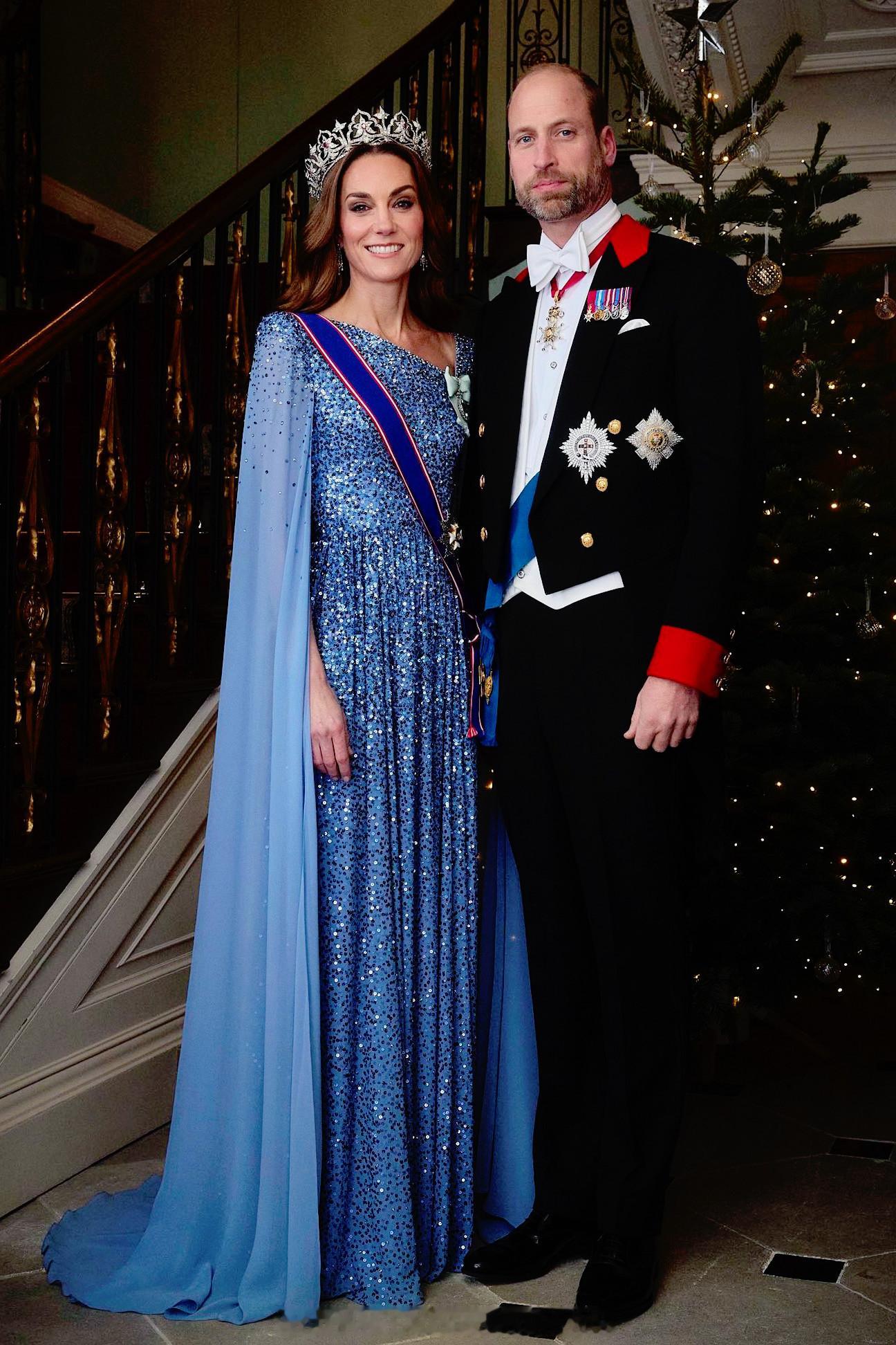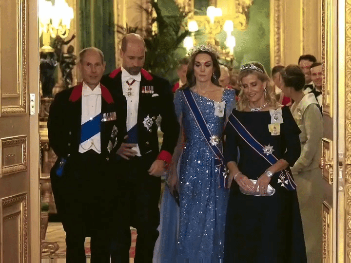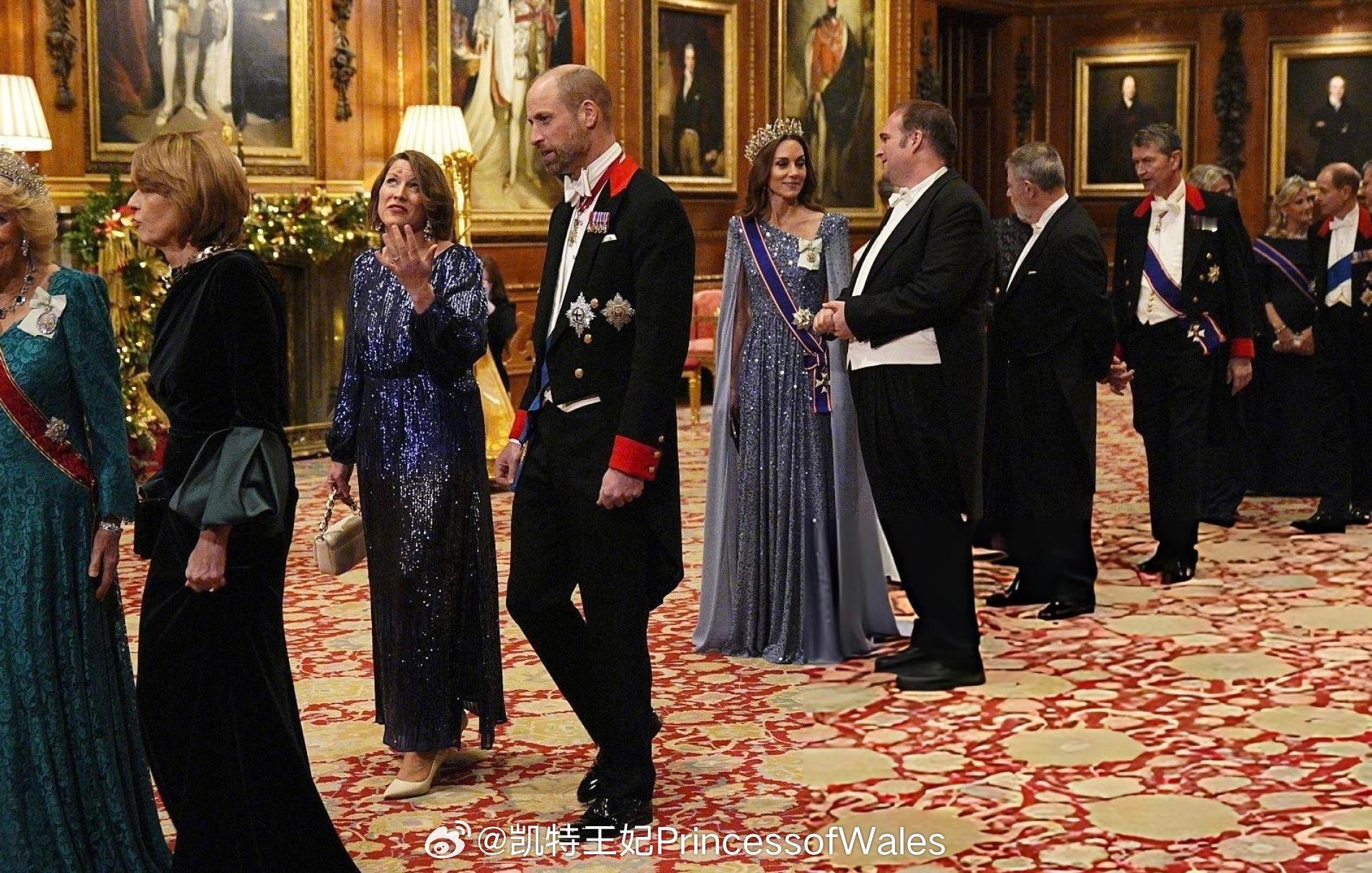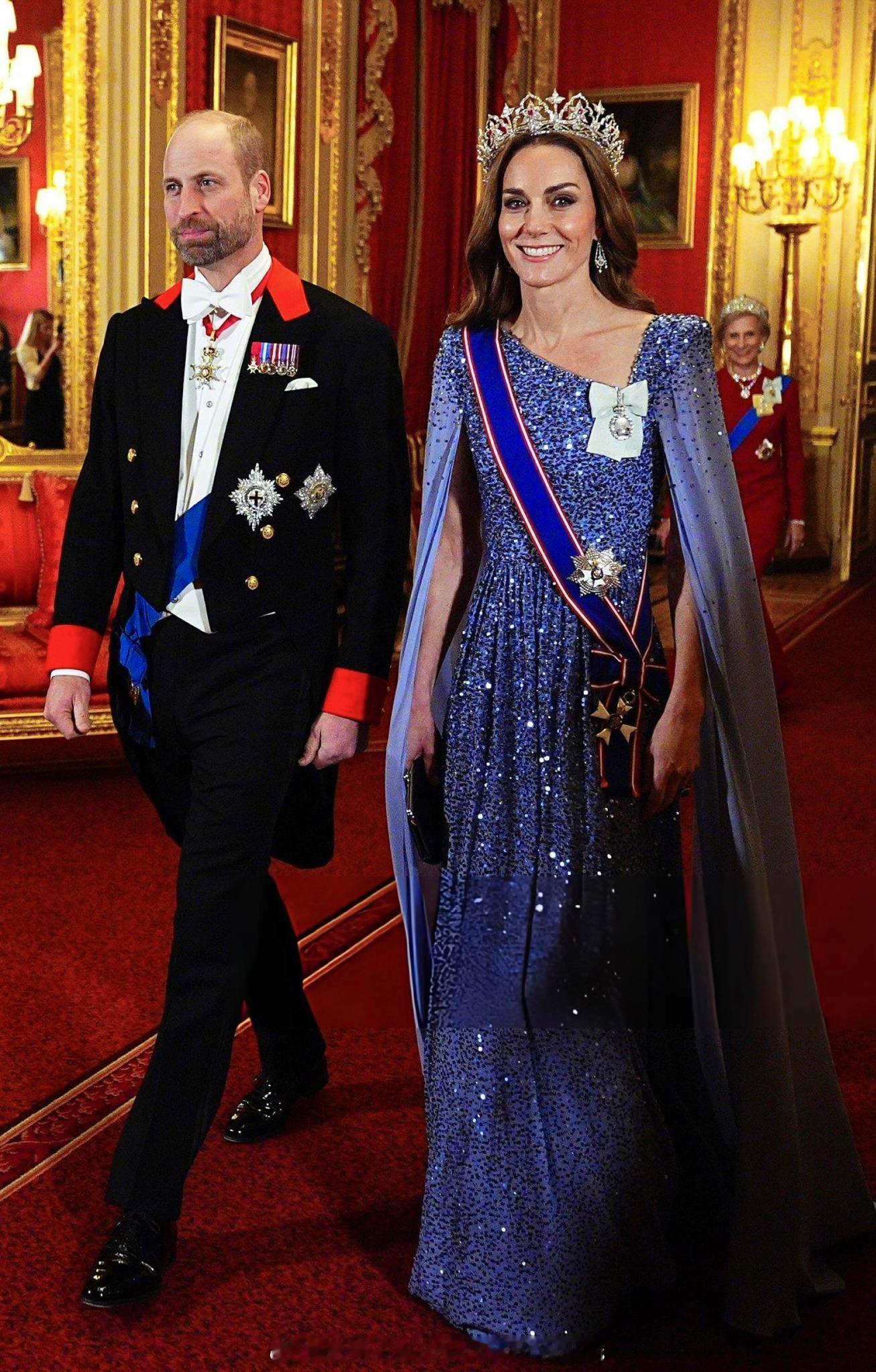 威尔士王妃凯特以一身深蓝色带浅色披肩亮片刺绣连衣裙亮相温莎城堡的国宴。当太阳