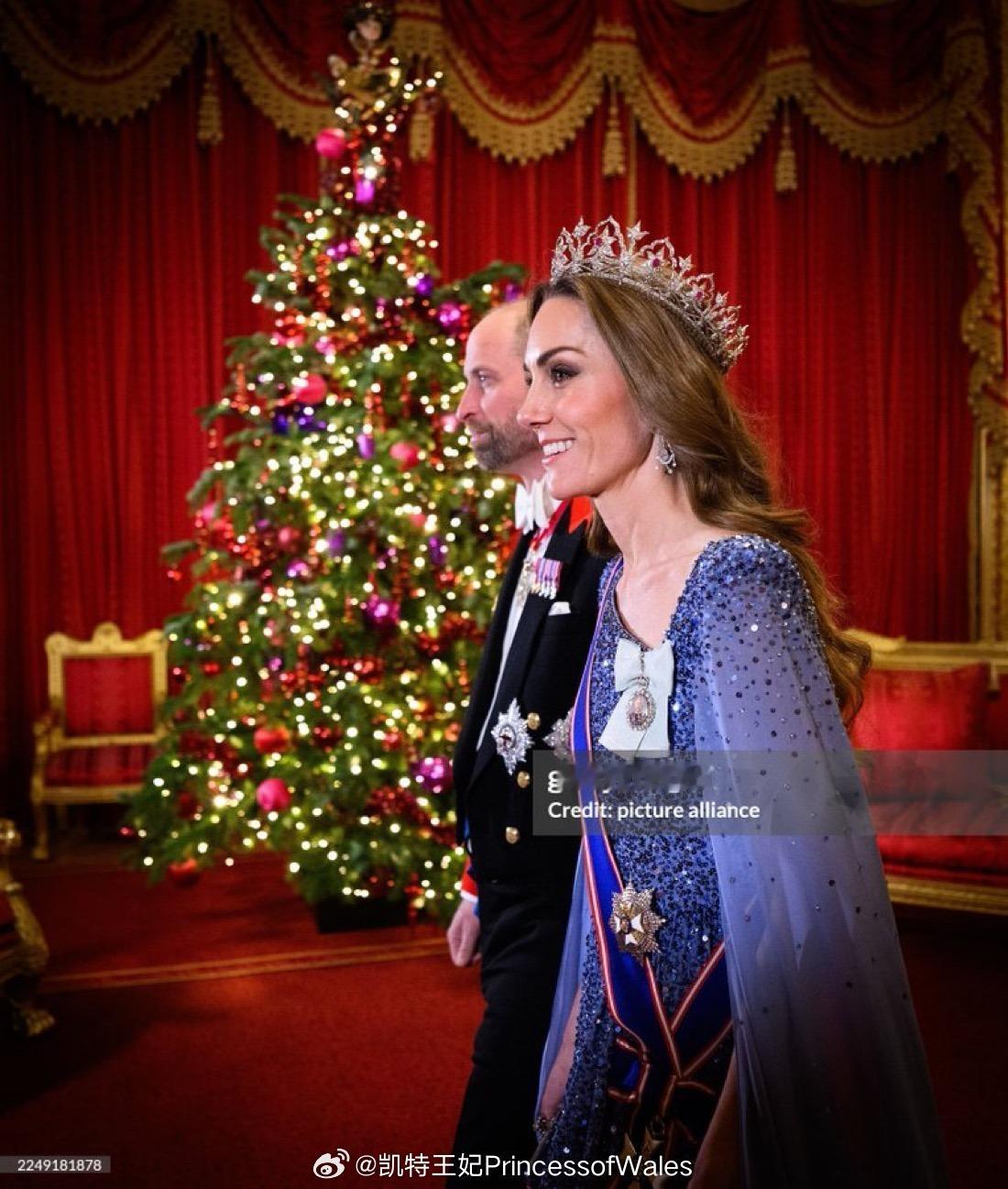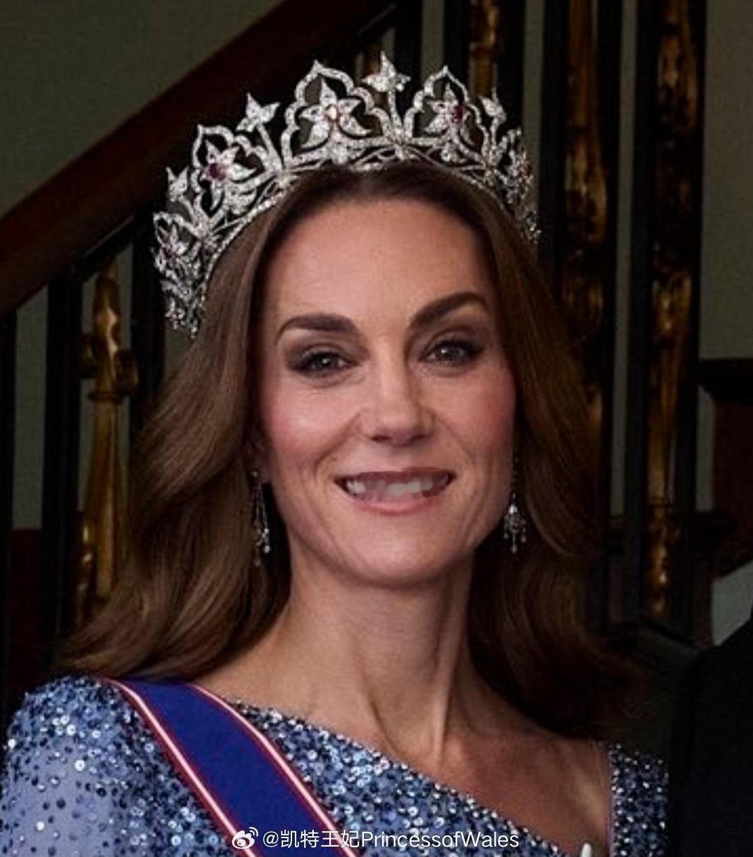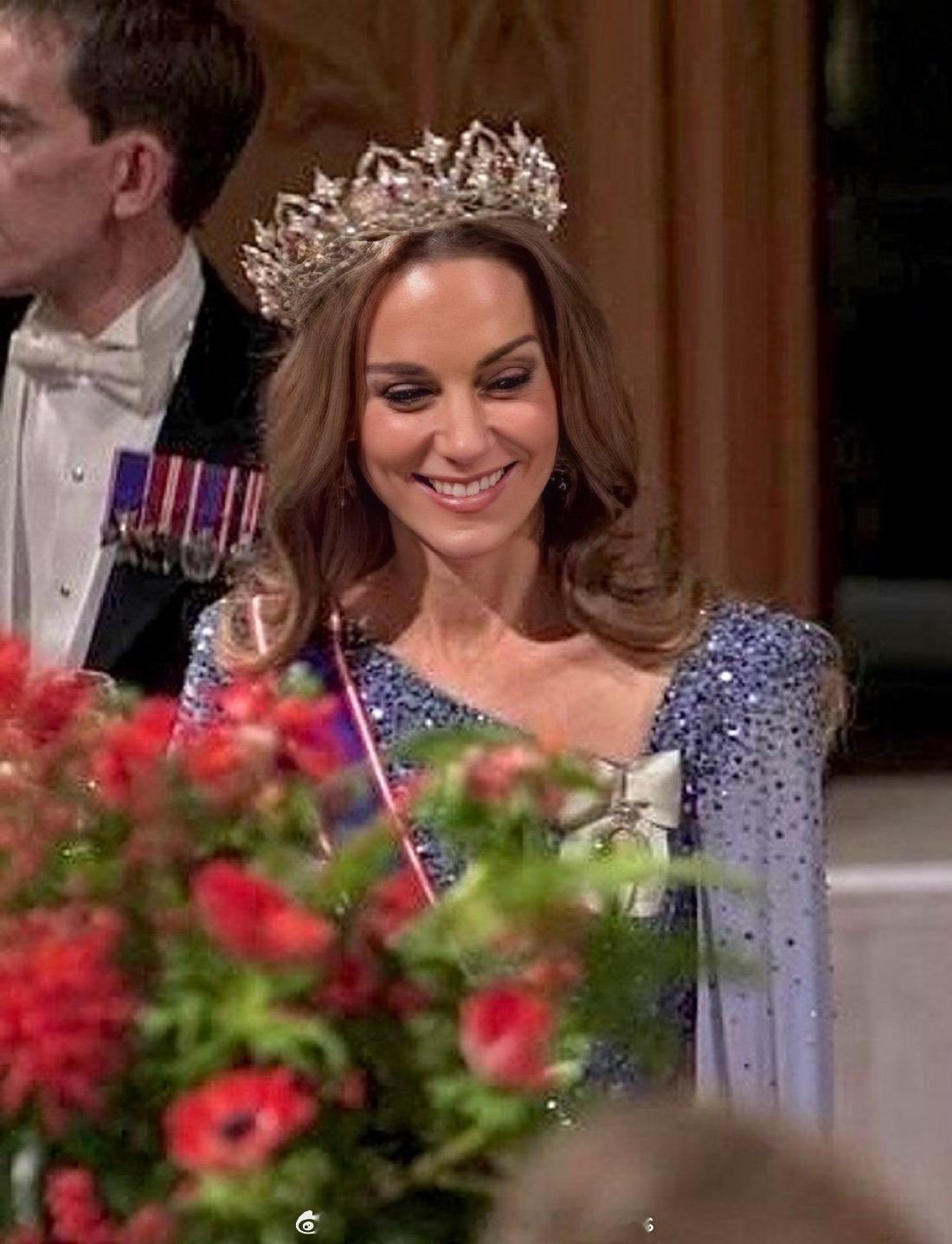 这一次的晚宴,凯特美得像公主!蓝紫色的星空礼服长裙,头上戴的是红宝石王冠,大卷