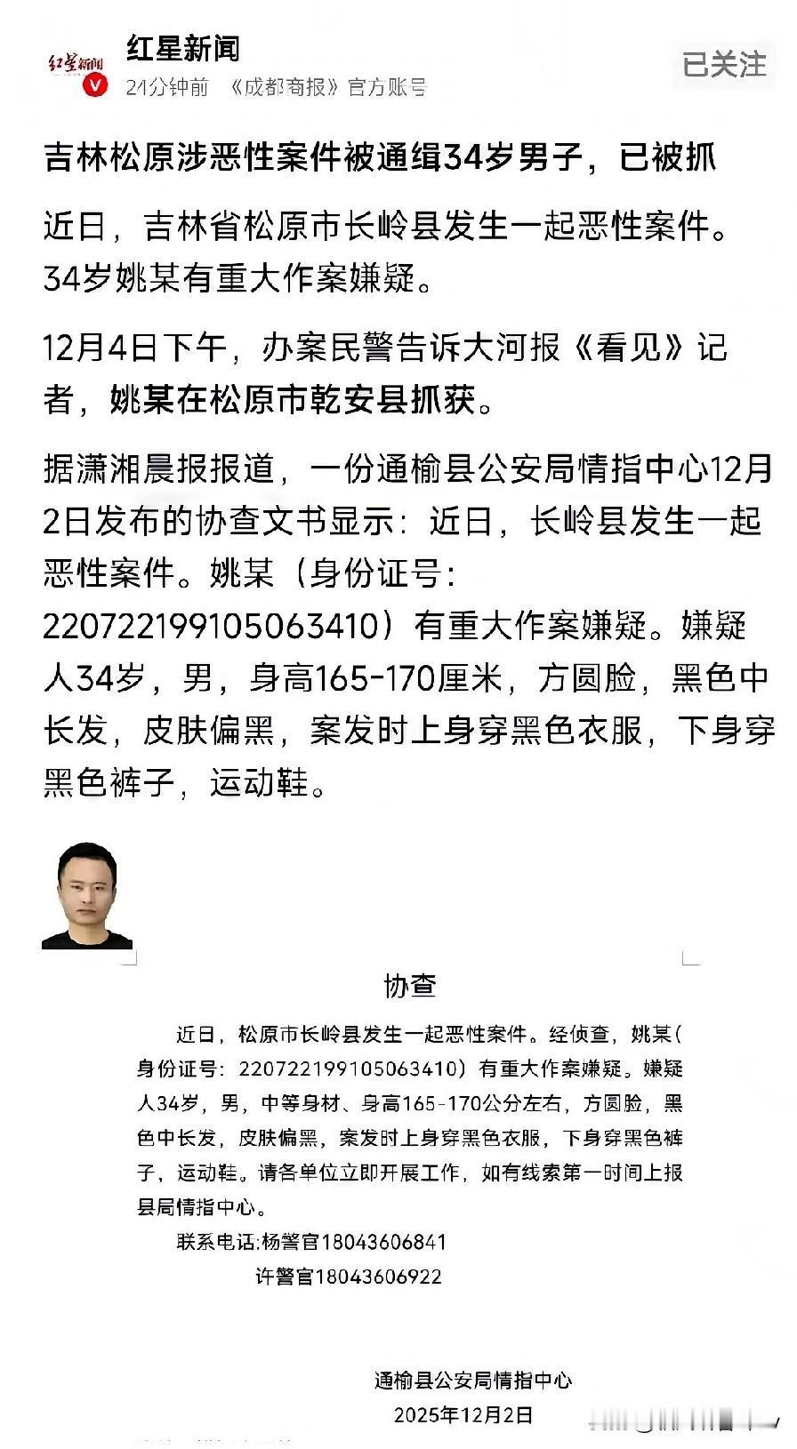 吉林34岁命案嫌犯落网!就在今天下午,吉林乾安县所字乡中裕村的一处破旧空房里,响起了警笛的收尾声——34岁的命案嫌疑人姚某,被100-200名警力成功抓获,全程没有出现网传的"服药自杀"情况。这个躲在无人居住老屋里的亡命徒,终究没逃过法网。 可能很多人不知道,姚某可不是初犯,而是个"五进宫"的惯犯:2009年起就因盗窃、抢劫多次入狱,最近一次刑满释放是2025年5月,距离这次作案才短短半年!12月1日在长岭镇、12月2日在通榆县,他接连犯下两起命案,夺走两条生命,之后就躲进了中裕村这间荒废已久的空房,以为偏僻就能瞒天过海。 但他显然低估了现在的刑侦实力——遍布城乡的摄像头、大数据轨迹追踪、警方的精密排查,再加上村民的全力配合,所谓的"隐蔽藏身地"不过是自欺欺人。100多名警力的围捕阵势,也足以说明警方破案的决心:不管你躲到哪里,只要犯了案,就必须为自己的行为付出代价。 34岁,本该是扛起家庭责任、踏实过日子的年纪,姚某却把人生耗在了偷鸡摸狗和暴力犯罪上。多次入狱的经历没让他悔改,反而变本加厉,从盗窃升级到命案,这背后是对法律的漠视,更是对生命的践踏。现在落网了,等待他的必然是法律最严厉的制裁,再也没有回头路可走。 这起案件也再次印证了"法网恢恢,疏而不漏"的道理:科技让破案更高效,警方让正义不缺席,任何试图挑战法律底线的人,终究逃不过制裁。你觉得对于屡教不改的惯犯,该如何加强惩戒与改造,避免类似悲剧重演?欢迎在评论区聊聊你的看法~
