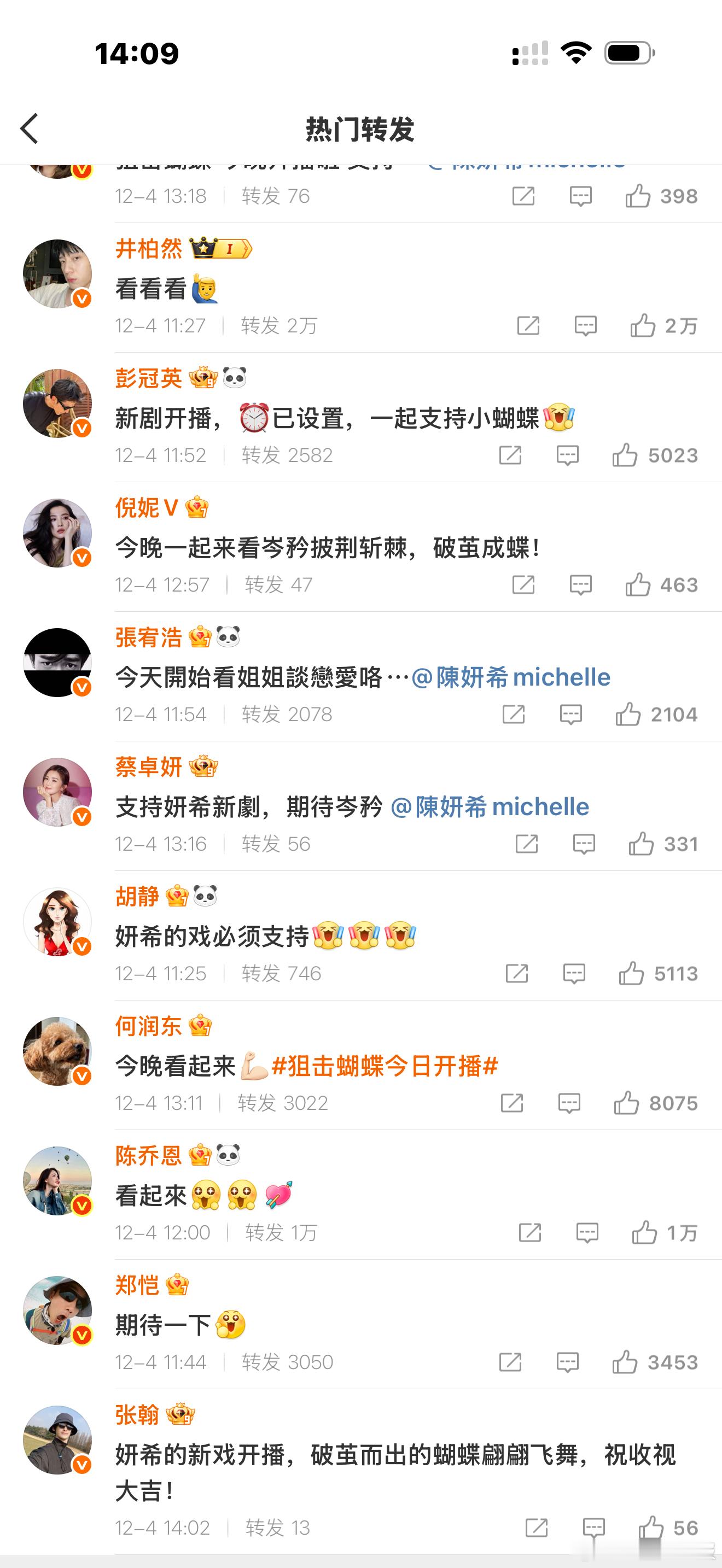 陈妍希娱乐圈人缘 新剧《狙击蝴蝶》今日开播,好朋友们帮忙宣传,阵容简直太豪华。真是被姐姐的好人缘震惊到了,转发列表一眼望不到头。那就今晚一起来看小🦋吧!