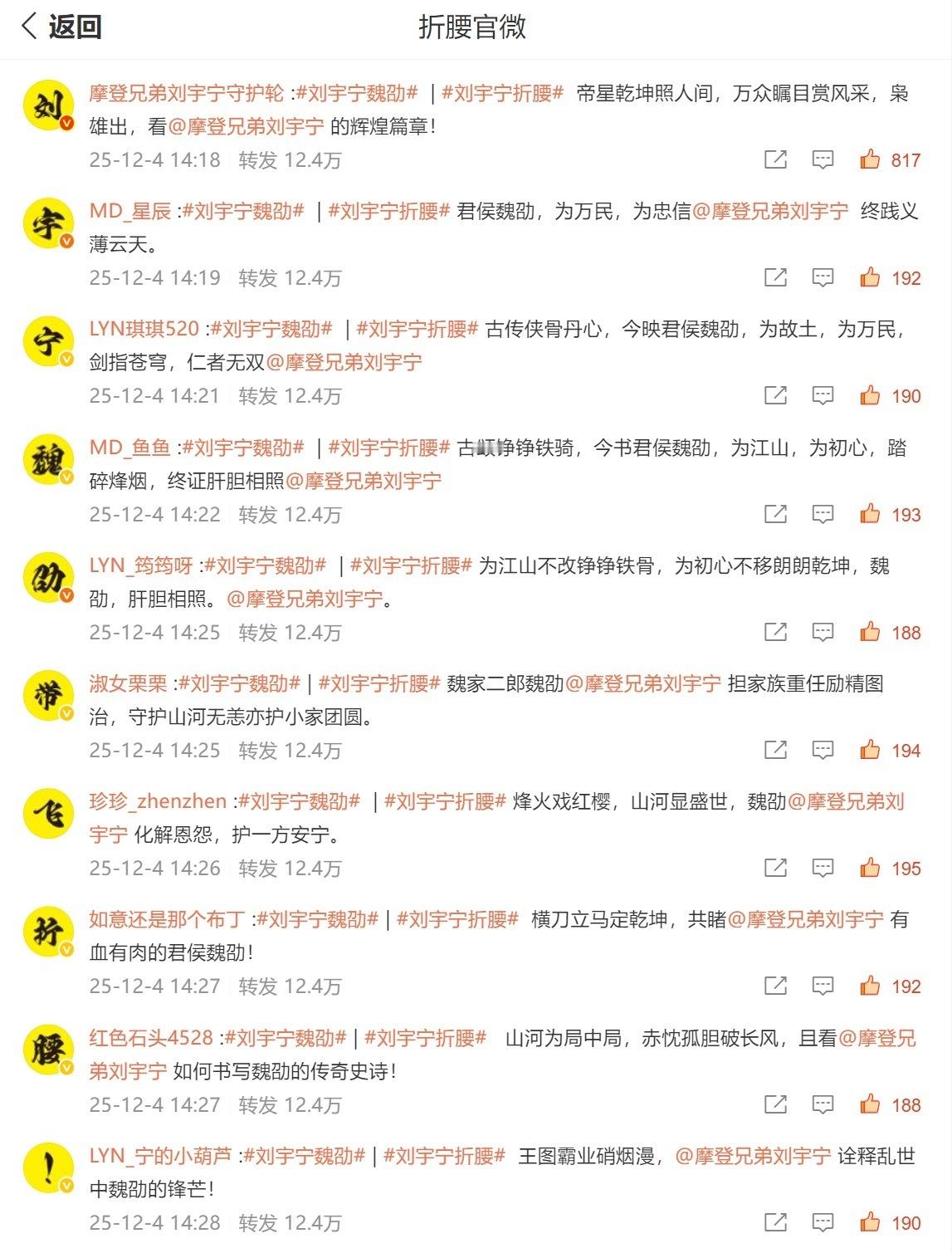 折腰官博搞投票,刘宇宁的魏劭直接断层第一粉丝把转发排成大字报,魏劭带飞剧组,排面稳了