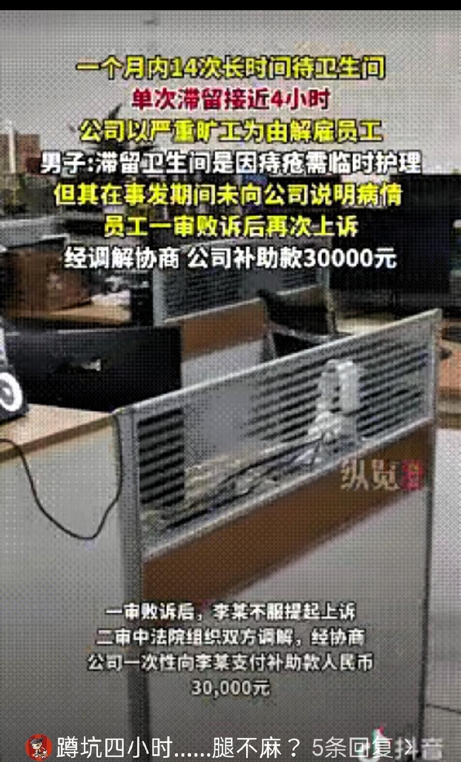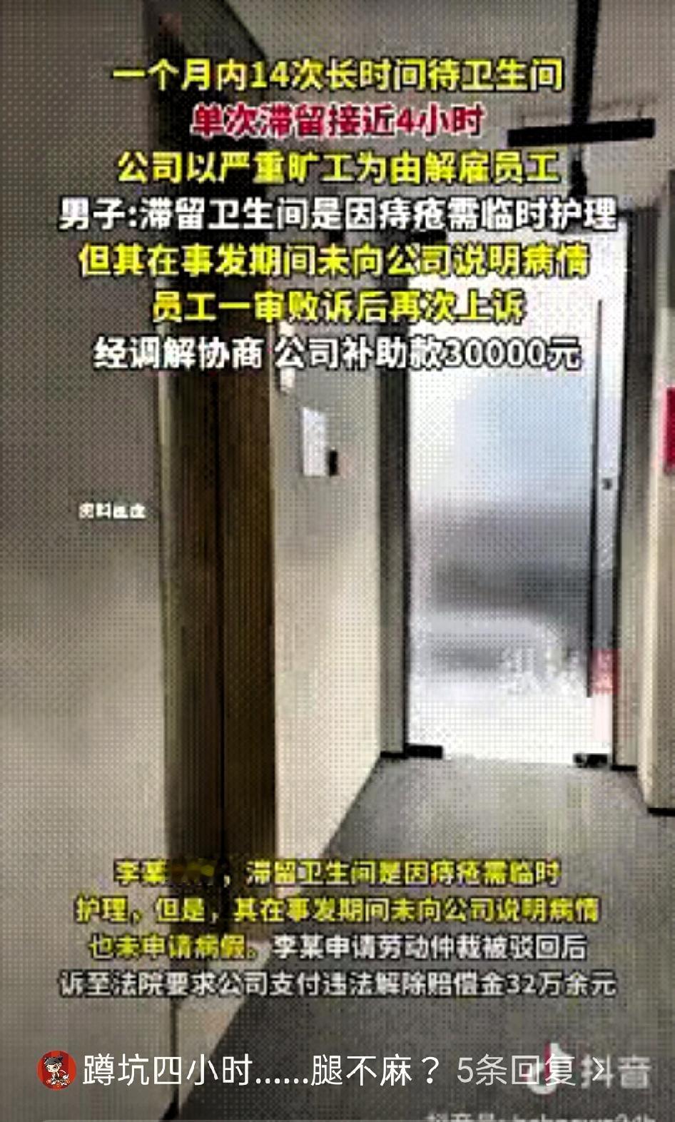 江苏苏州,男子上班期间在卫生间一待就是4小时,一个月内出现14次同样情况,公司以严重旷工为由将他解雇。 他不服,先后两次上诉,要求赔偿32万,说自己是因为痔疮发作,在卫生间处理病情。 其实痔疮确实是常见的毛病,身体不舒服需要处理也能理解,但关键在于,李先生从头到尾没跟公司提过自己生病,也没走任何请假流程。 他在公司待了十多年,2020版的《员工手册》双方都认可,里面写得很清楚:未经批准离开岗位超过一定时间算旷工,半年累计旷工3天以上属于严重违纪,公司可以解除合同,这些规定他不可能不知道。 公司发现他频繁不在岗后,先尝试微信联系他,没得到回应,后来查看办公区监控,才确认了他长时间待在卫生间的情况。 解雇前,公司还征得了工会的同意,整个流程是符合规定的。李先生后来提供的证据,像是配偶5月的网购药品记录,还有6月和明年1月的住院手术记录,都是事发之后才拿出来的,事发当时他压根没向公司说明病情,也没提交任何证明。 职场里,身体不舒服是难免的,但规矩就是规矩。不管什么岗位,长时间离岗不说明情况,都会影响工作。 李先生是工程师,岗位需要随时响应工作需求,他动不动就几个小时联系不上,手头的工作、团队的配合肯定会受影响。 要是他早跟公司沟通,说明自己的病情,按流程申请病假或者调休,公司大概率会体谅,也不至于走到解雇这一步。 最后法院一审认定公司解雇合法,李先生上诉后,在法院调解下,公司给了他3万元补助,这事才算结束。这3万元,更像是公司考虑到他工作了十多年,给的一点人情补助,并不是因为公司理亏。 说到底,这事的核心就是沟通和规矩。员工有健康方面的需求,公司有正常运转的要求,双方互相理解、按流程办事,很多矛盾就能避免。李先生要是一开始就主动沟通,按规矩请假,也不会丢了工作,还打了一年多的官司。