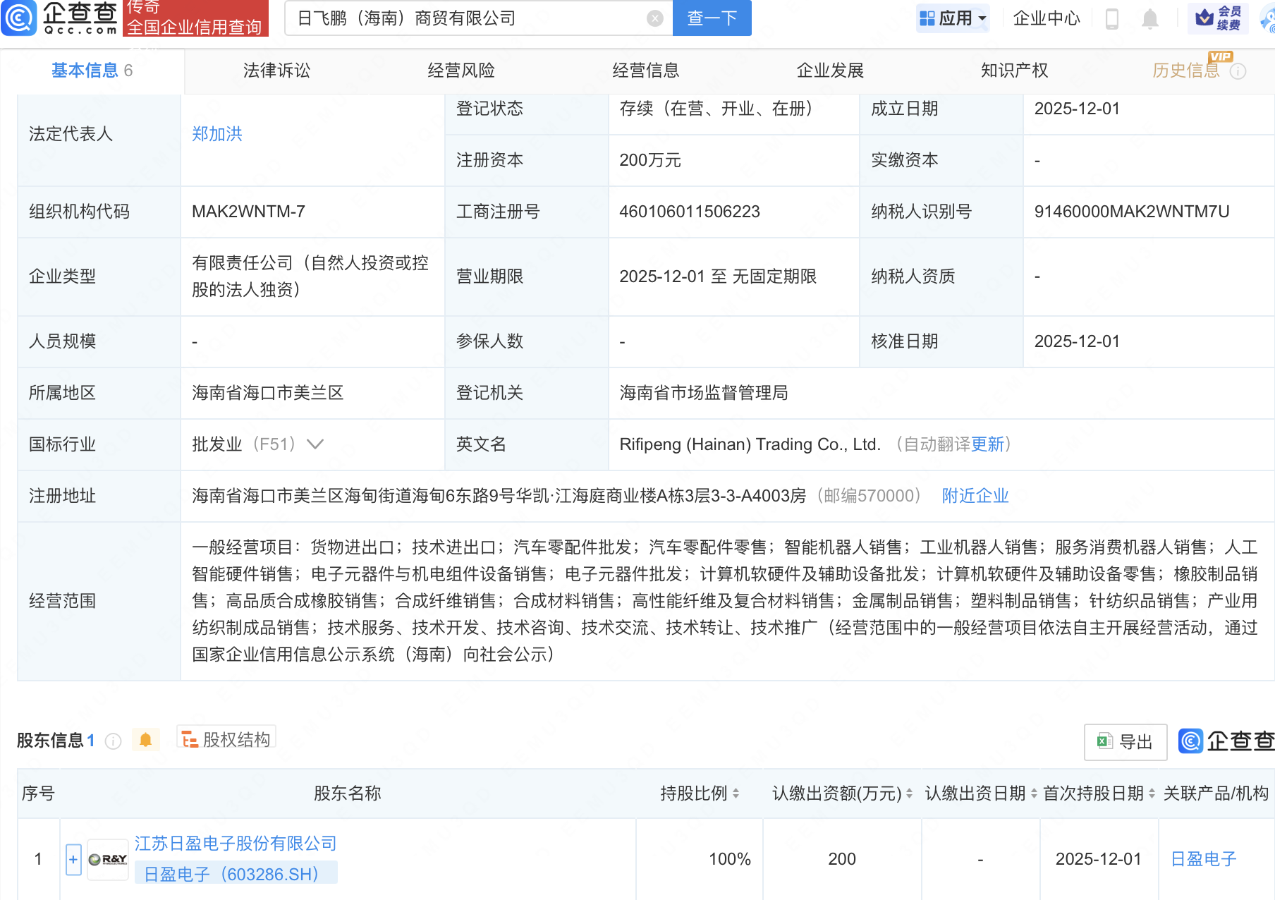 企查查APP显示,近日,日飞鹏(海南)商贸有限公司成立,经营范围包含:智能机器人销售;工业机器人销售;服务消费机器人销售;人工智能硬件销售等。企查查股权穿透显示,该公司由日盈电子(603286)全资持股。