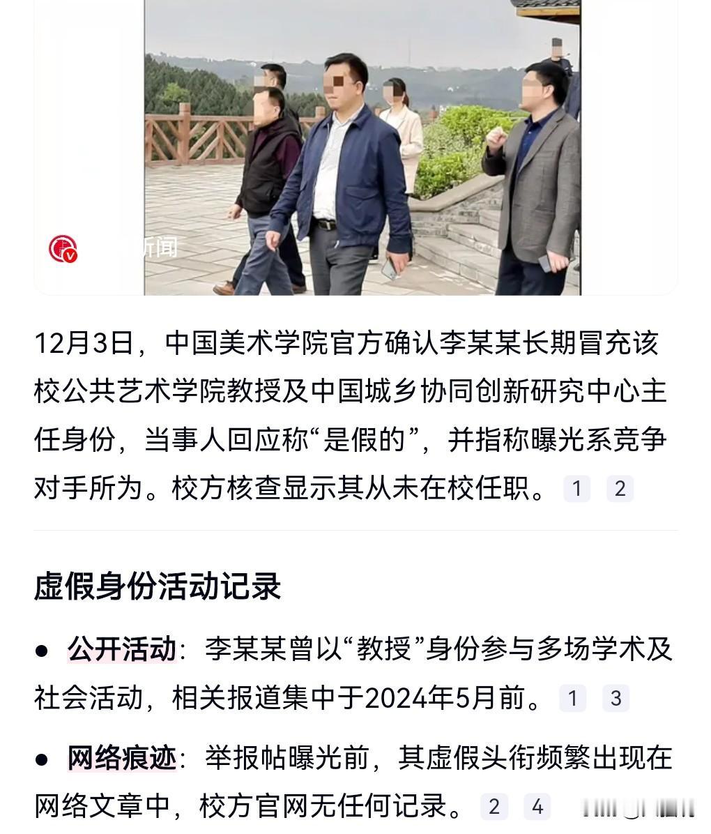 这真的是招摇撞骗啊,必须严肃处理,感觉要坐牢才行啊。 12月4日我在网上看到这么个事情。 一男子长期冒充中国美术学院的教授。 这名男子现在想推卸责任了,说事情已经过去了,再翻出来已经没有意义了。 真的是想的太异想天开了,冒充教授身份竟然如此轻描淡。 必须追究他招摇撞骗之罪。