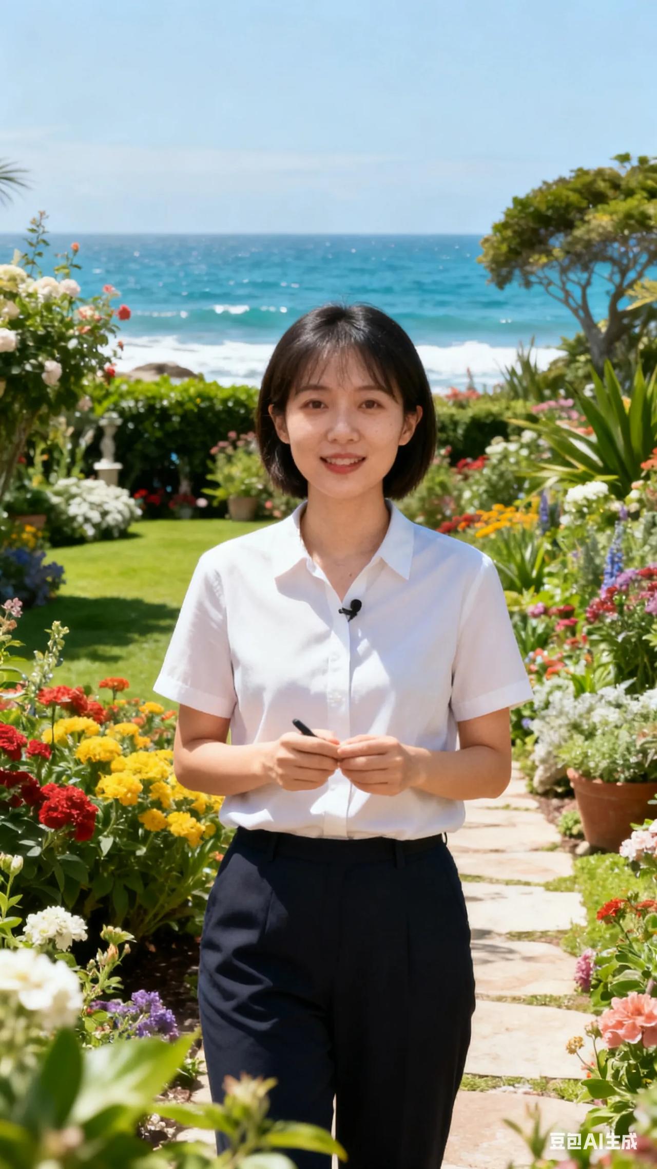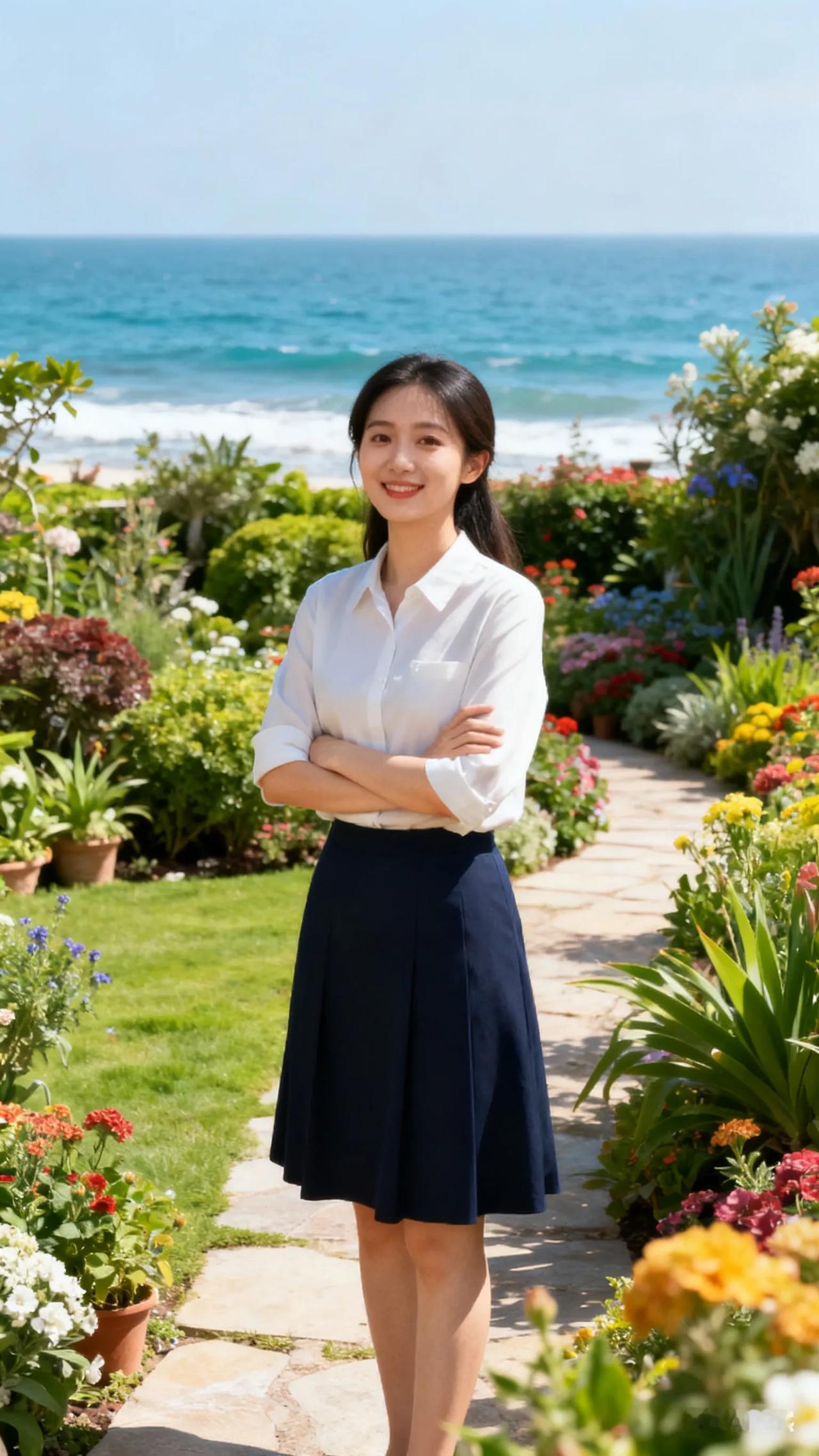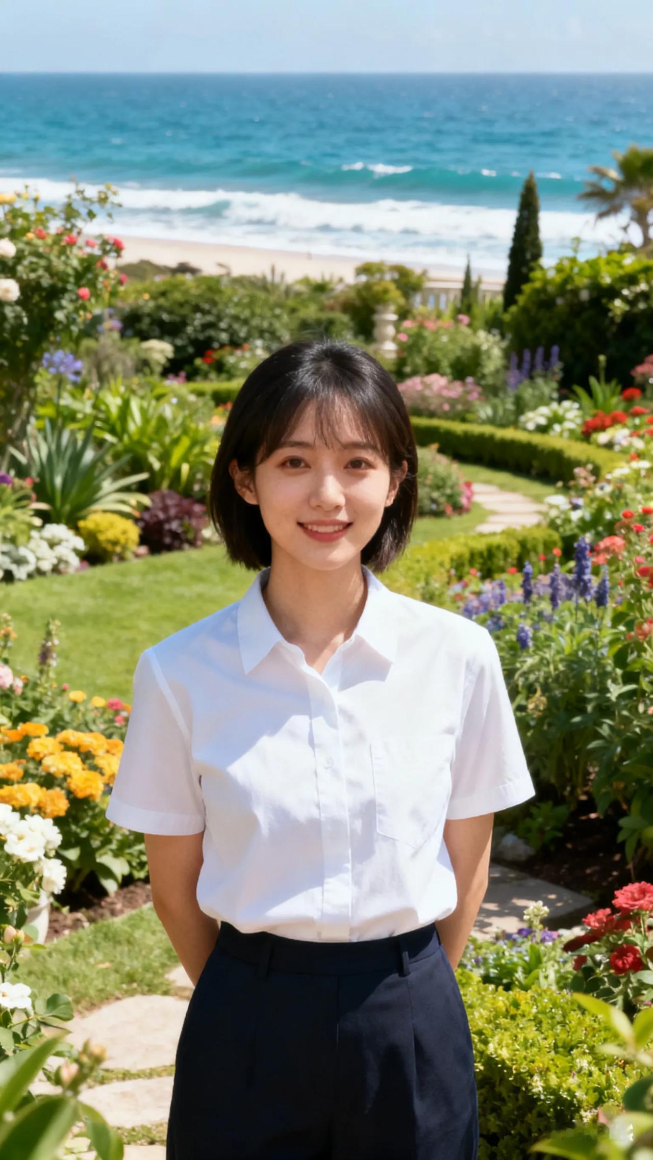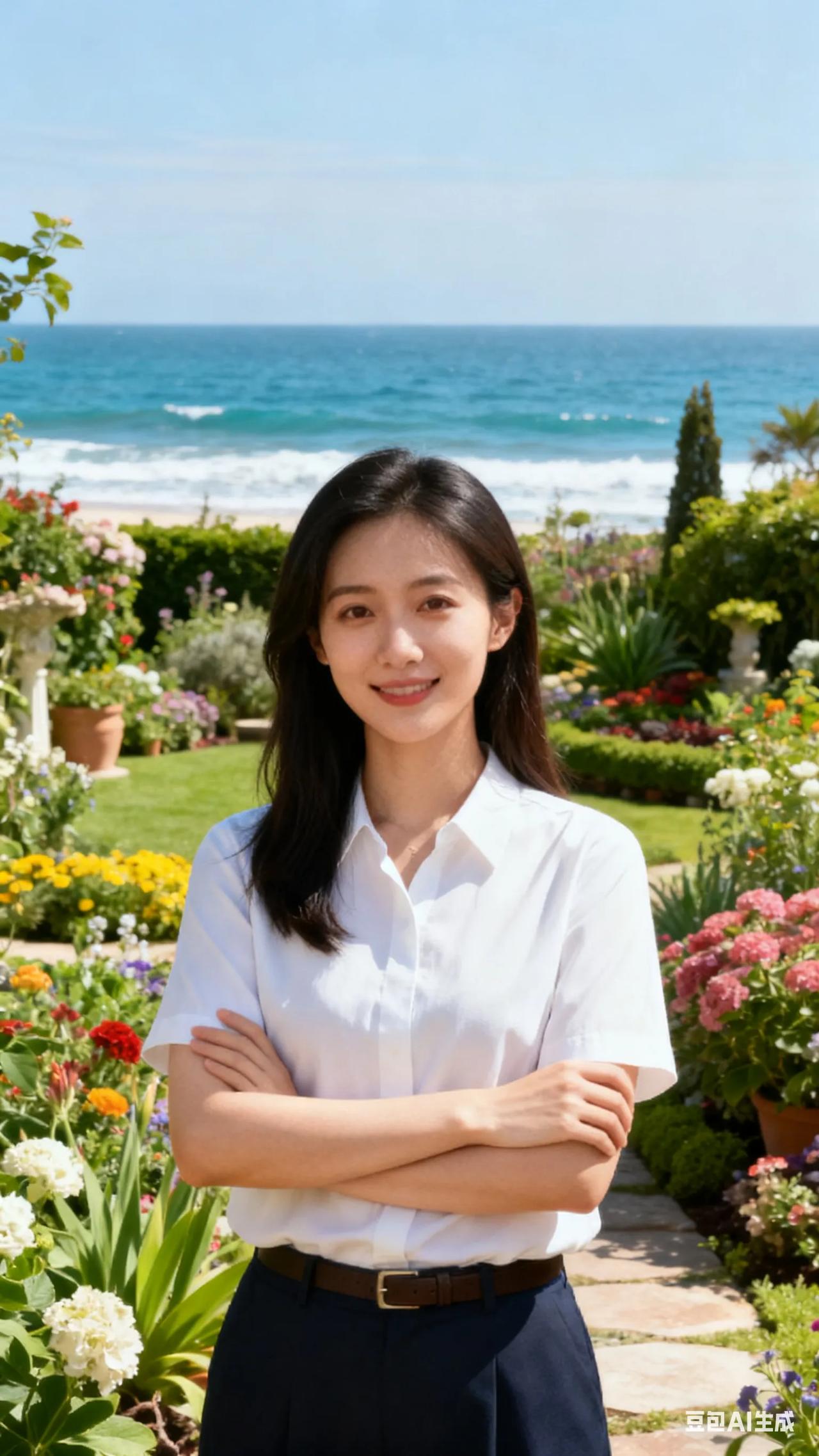 海边花园里的清新少女,微笑面对阳光!🌞🌸🌊
