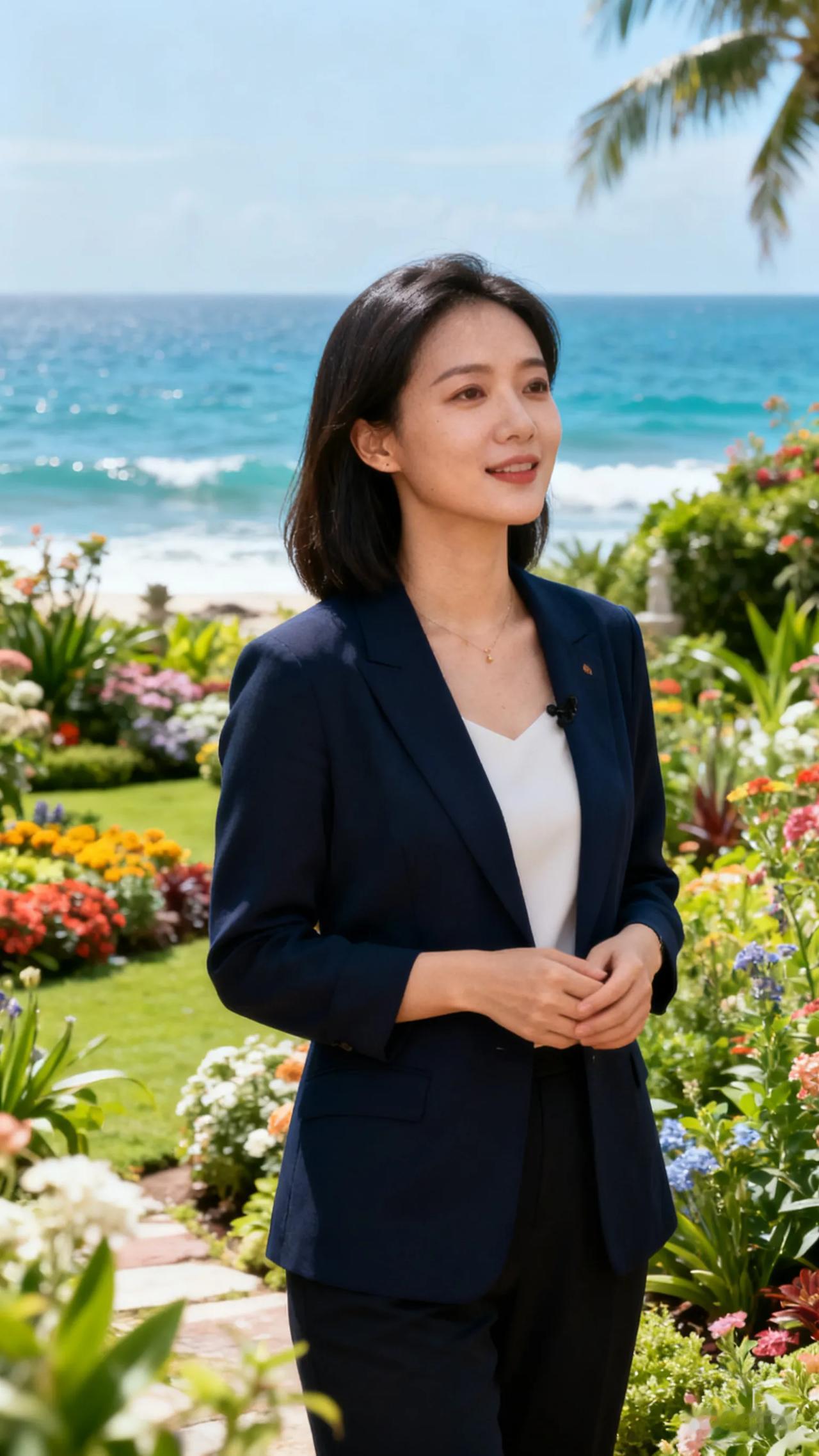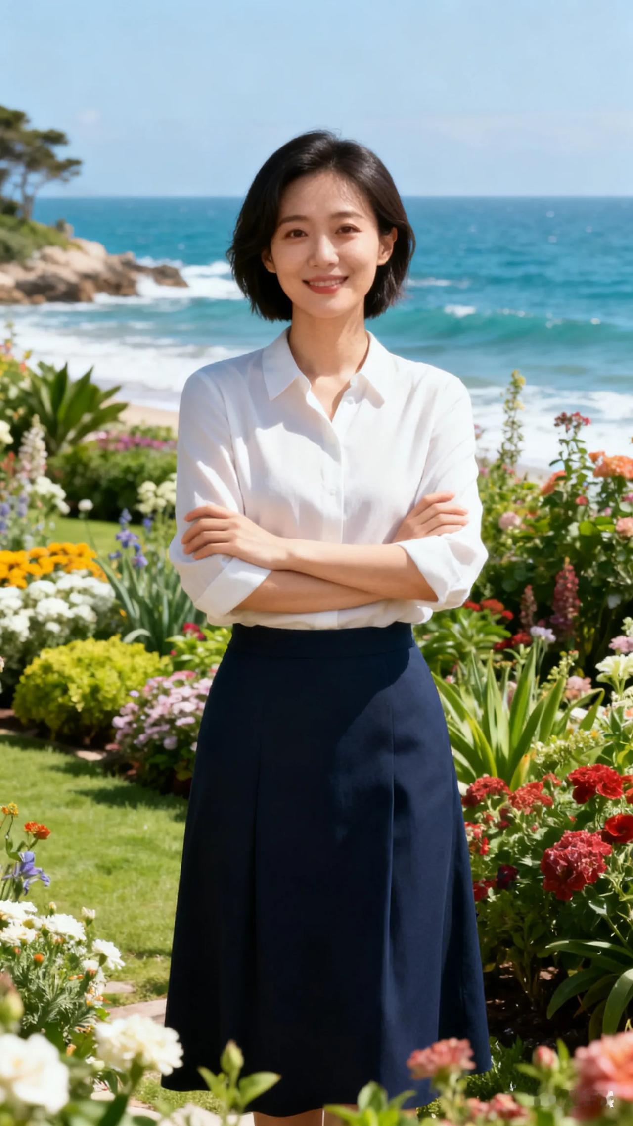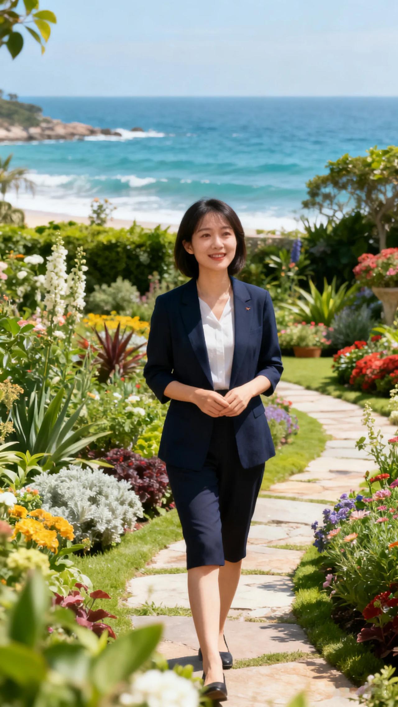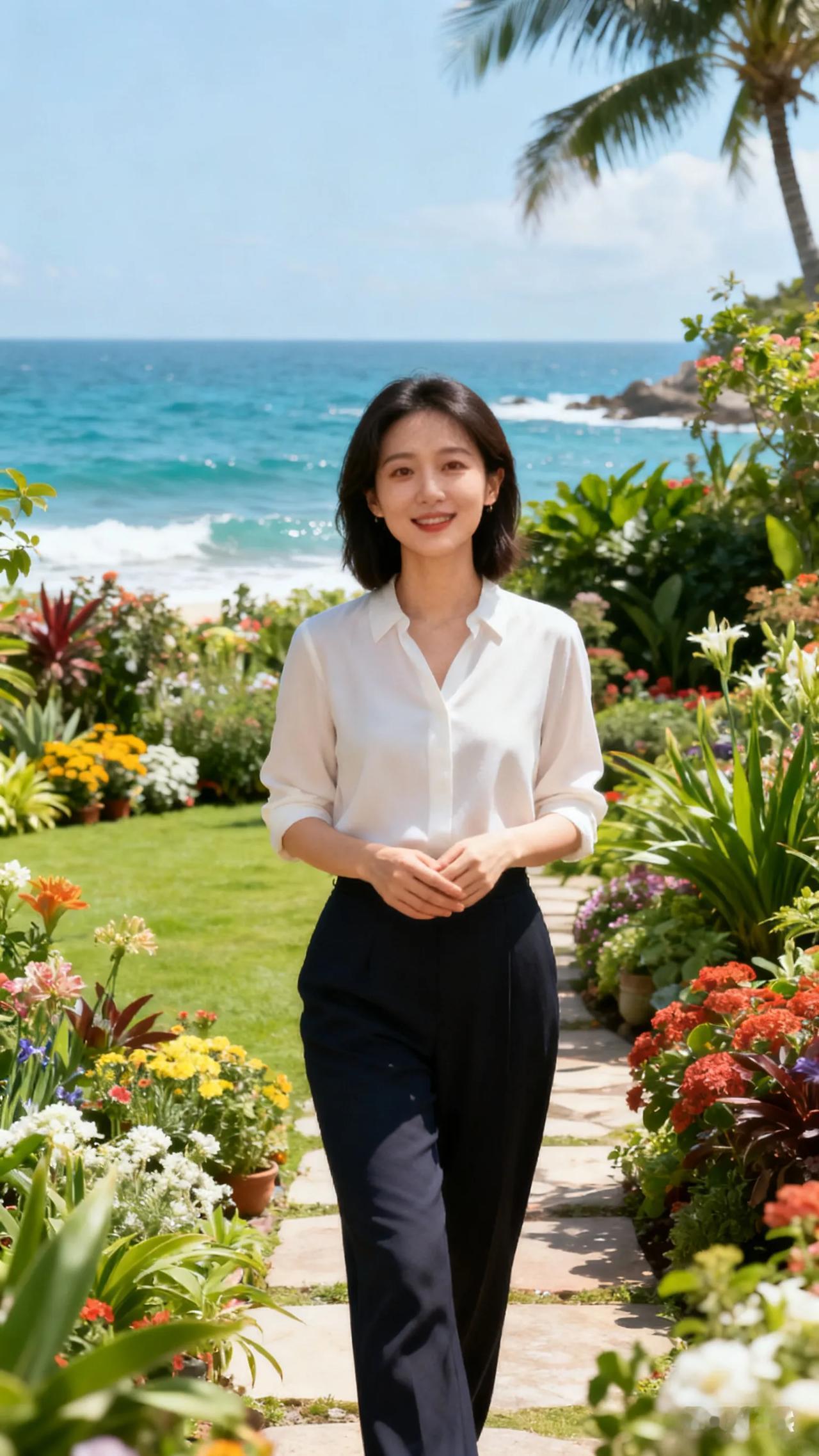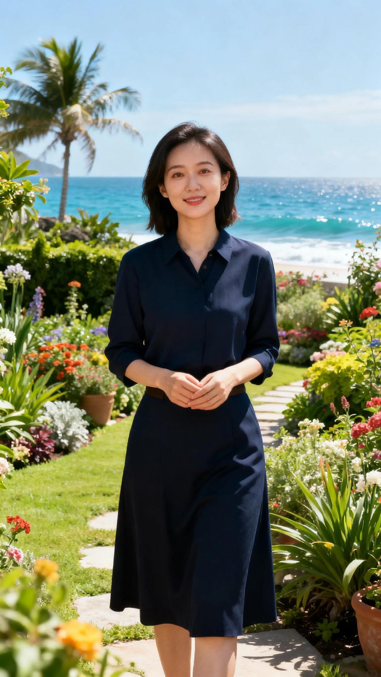 海边花园里的清新少女,微笑面对阳光!🌞🌸🌊