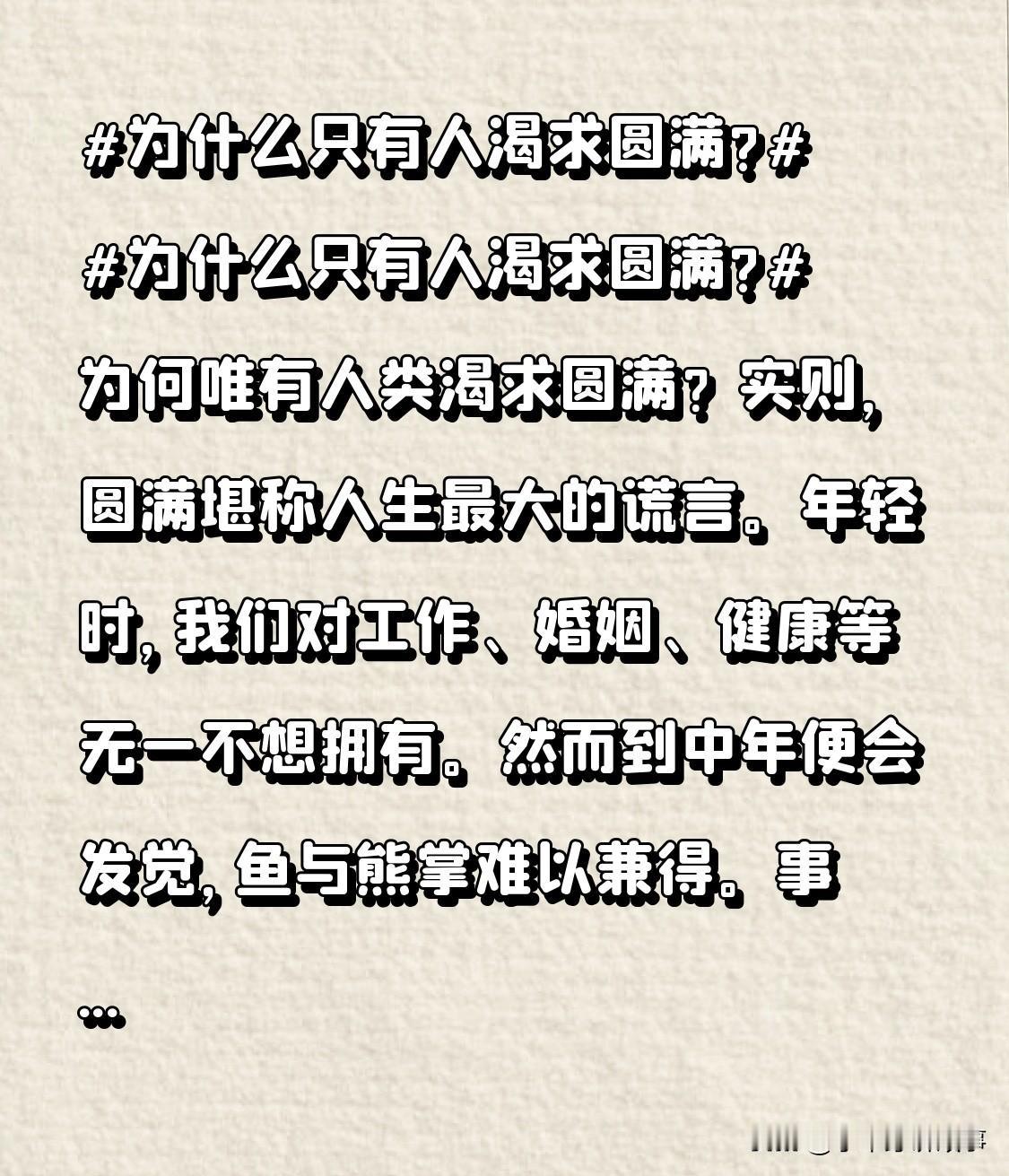 为什么只有人渴求圆满? 为什么只有人渴求圆满? 为何唯有人类渴求圆满?实则,圆满堪称人生最大的谎言。年轻时,我们对工作、婚姻、健康等无一不想拥有。然而到中年便会发觉,鱼与熊掌难以兼得。事业有成者,常无暇顾及家庭;家庭美满者,经济上却可能捉襟见肘。 圆满还可能使人陷入困境。拥有太完美之物,我们会害怕失去,变得患得患失、压力倍增。真正通透之人,不执着于圆满,接受遗憾、与缺憾共处,反而能释放力量。所以,渴求圆满只是一场梦,接受不圆满才是生活真谛。