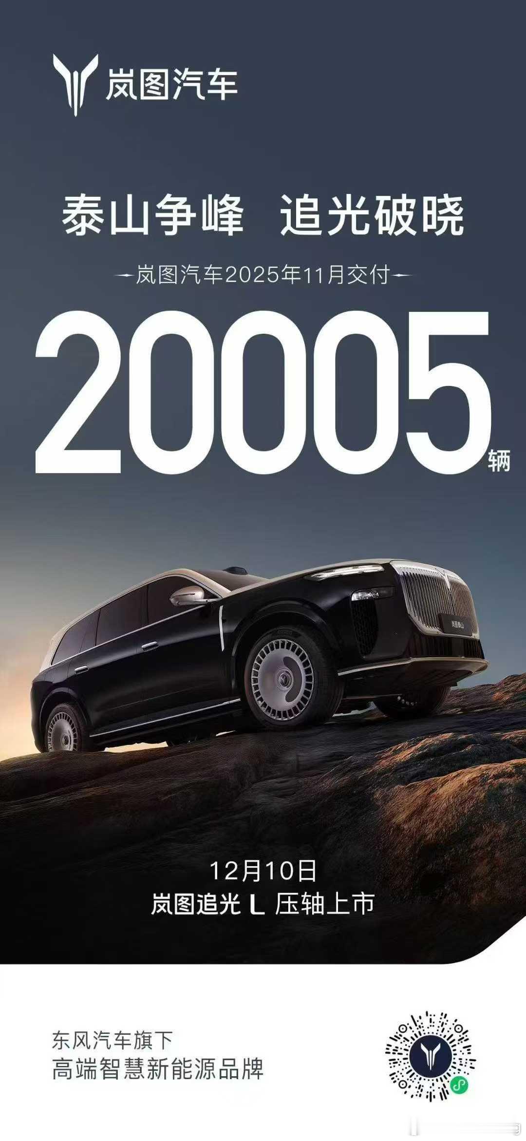 哥?是它?抱华为大腿谁不会?能抱出硬成绩的还得看岚图。11月交车20005台,华为HI模式销量榜首名副其实。更猛的是,12月10日追光L上新,华为高阶智驾、鸿蒙座舱、电驱系统一整套全上,颜值还拉满国风气场。岚图这一手绝非抄作业,分明是直接砸场子,“小尊界”在追光L身上已经彻底焊死。等发布会,共同见证追光破晓上市!岚图追光L12月10日正式上市华为HI模式小尊界实至名归华系车天花板豪华